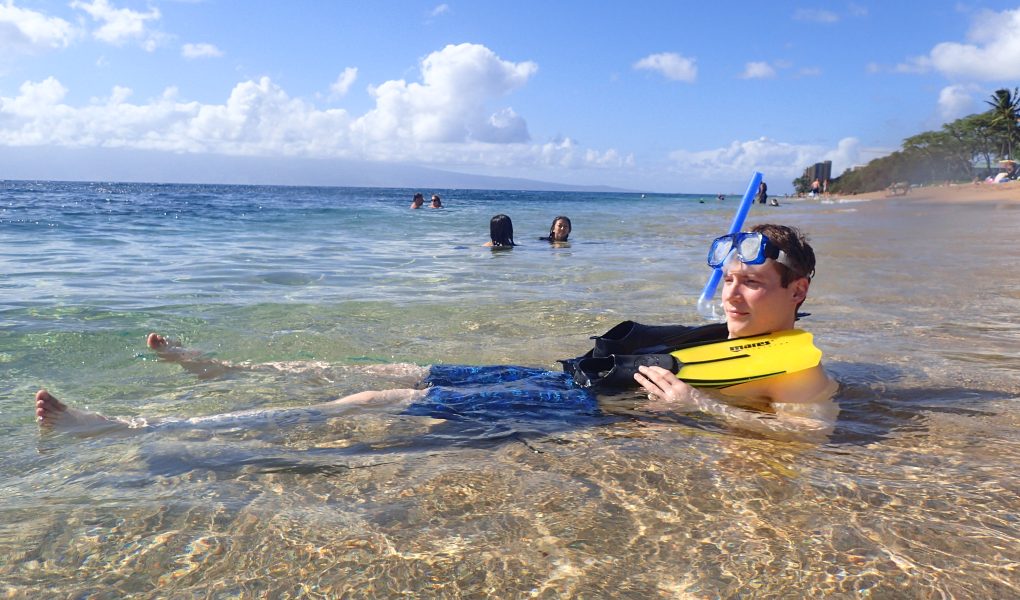 Jokunen minuutti siinä meni kunnes maski ja snorkkeli tuntuivat taas normaalilta tavalta olla ja hengittää. Korallit päättivät pehmeän hiekkapohjan juuri hyvästä syvyydestä että oli helppo lähteä uimaan ja (kun korallit eivät tule ihan rantaan) hengata vedessä telomatta itseään koralleihin. Vaikka olen suoraan sanoen vähän skeptinen näistä hienoiksi korallimestoiksi sanotuista rannoista niin tämä kyllä ylitti odotukseni. Hyvän näköiset korallit ja siellä täällä uiskentelevat monen kirjavat kalat olivat hienoa katseltavaa. Mustat ja keltaiset pikkukalat uivat isoissa parvissa. Yksittäisinä otuksina uivat sinisen sävyiset sateenkaarikalat, valkoiset oranssiraitaiset, tummanruskeat valkojuovaiset ja Hawai’in kansalliskala Humuhumunukunukuapua’a. Melko pian Antti huomasi ison honun, joka ui vastavirtaan. Saimme kunnon uimatreenin kun seurasimme tuota vedessä leijuvaa ihanaa otusta muutaman minuutin.