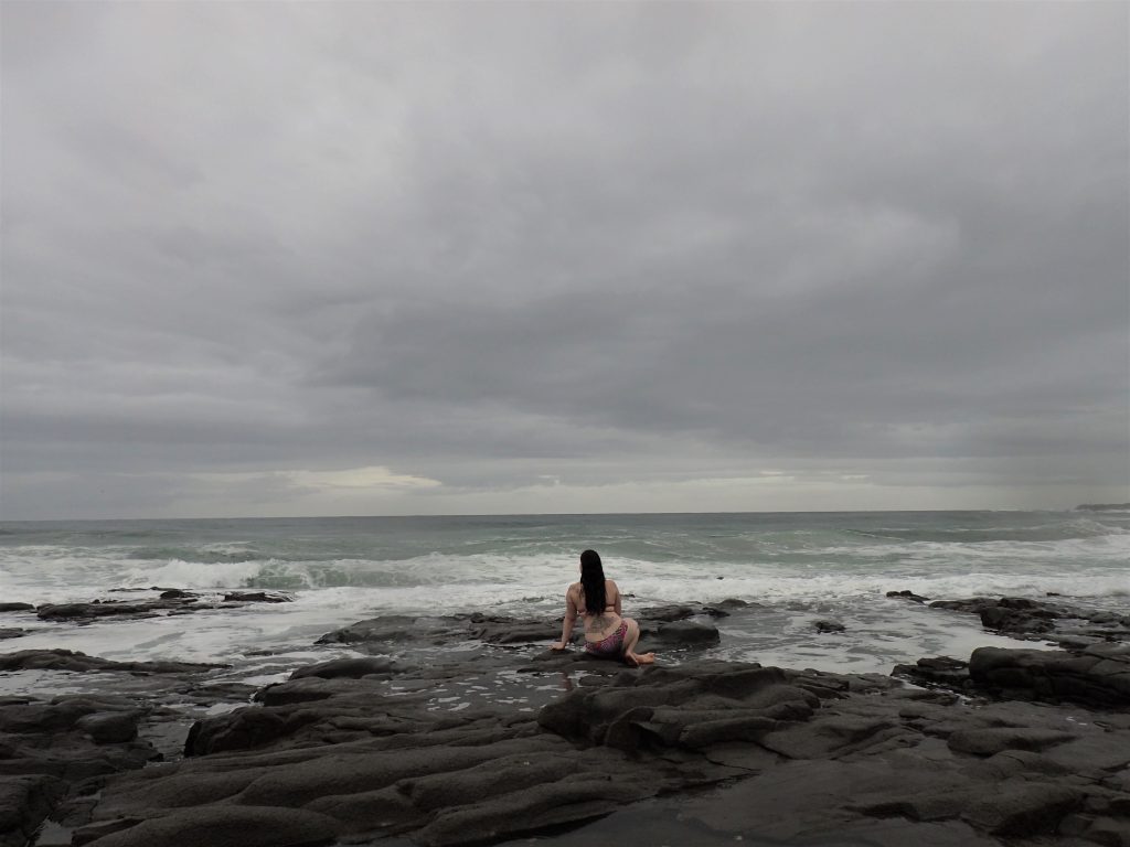 Mutta mereenkin piti päästä. Tinley Manor Beach sekä löytyi että oli ilman minkäänlaisia portteja. Sadetta piti tuona päivänä koko päivän, mutta ei kovin rankasti. Antti oli päättänyt bongata Intian valtameren itselleen, koska ei ollut ikinä aiemmin siinä meressä uinut. Jonkin verran piti laskeutua rannalle, joka oli osittain kivikkoa, mutta sitten siellä aukeni ihana autio hiekkaranta. Asutusta ja rikkaan näköisiä taloja oli rinteessä rantaa vasten. Ajattelimme, että tuskin meitä täällä kukaan enempää katselee tai kieltää uimasta. Vesi tuntui ihanan lämpimältä pienen sateen kastelemaa ihoa vasten. Aallot olivat aika hurjat eikä uimisesta olisi tullut mitään. Tämä oli enemmänkin pulahdus ja hyppimistä aalloissa. Kivien rajaamassa altaassa lapset pääsivät leikkimään. Siellä uiskenteli ihan pikkuisia pitkulaisia kaloja. Isoista aalloista tuli välillä lisää vettä pikkualtaisiin. Hurjista aalloista huolimatta tämä oli ihanan idyllinen ja puhdas ranta. Vain me ja jotkin ravut olimme biitsillä. Vähän kielletty biitseily oli meistä tosi huippu juttu.