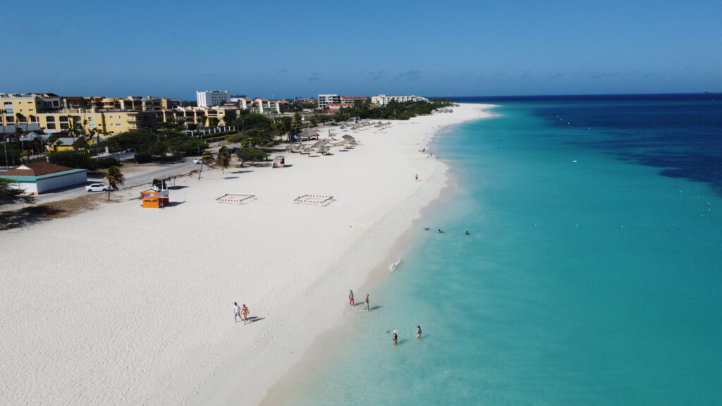 Lentävät turistit saapuvat Aruballe Queen Beatrixin lentokentälle hieman Oranjestadista etelään. Hotellit sijaitsevat pääosin Aruban länsi/lounaisrannalla, Oranjestadista rantaa pitkin pohjoiseen. Taximatka hotelliin kustantaa noin 30 $. Se kulkee alkuun Oranjestadin rantakatua L.G. Smith Bulevardia pitkin ja matkalla voi jo bongata tuttuja luksusshoppeja, joihin tulla shoppailupäivänä kiertelemään. Muutaman minuutin kuluttua pääkaupungista saavutaan Divi Beachille, jonka vierestä löytyvät ”Divi-merkkiset” hotellit. Divi biitsi jatkuu pohjoiseen mentäessä, mutta nimi vaihtuu. Eagle Beach on saaren kehutuin hiekkaranta ja ihan maailmanlaajuisestikin kärkisijoilla. Yli kilometrin pituisen rannan vieressä on rivi hotelleja. Eagle Beach päättyy pohjoisessa rantakivikkoon muutaman sadan metrin matkalle ja kun hiekka taas alkaa, niin ollaan Palm Beachillä ja jälleen edessä on rivi hotelleja.