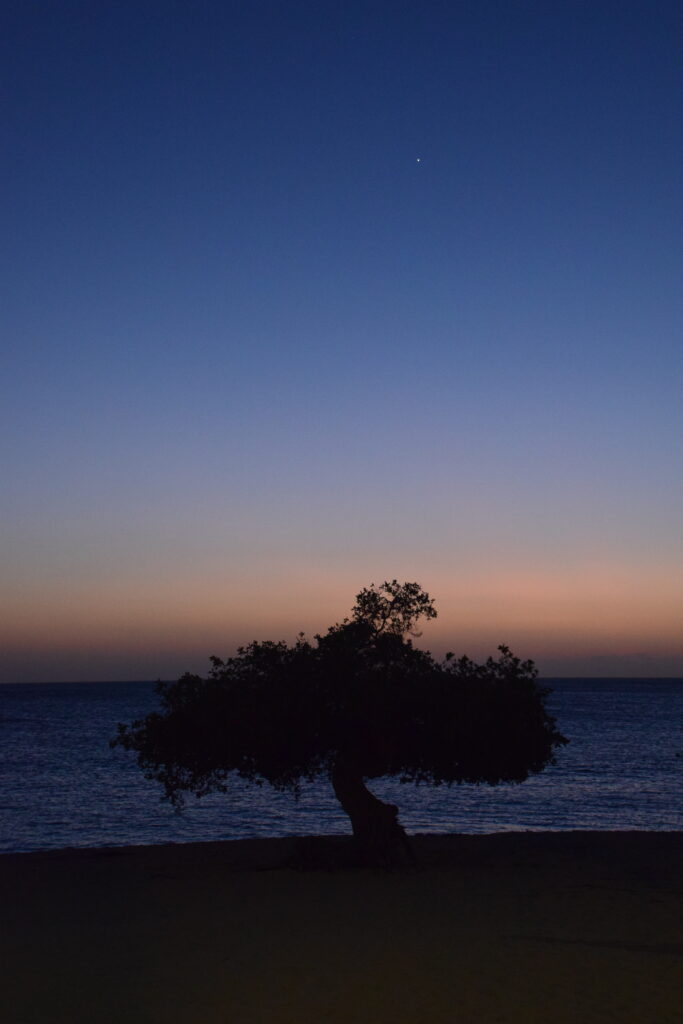 Eagle Beach on maineensa veroinen, mutta ei Divikään selkeästi huonompi ole. Käytännössä se on samaa biitsiä. Eagle Beach tarjoaa lähes täydellisen biitsielämyksen. Hienoa hiekkaa riittää kilometrin verran. Se jatkuu sopivasti syvenevänä mereen eikä teräviä kiviyllätyksiä tule vastaan. Eagle Beach tarjoaa myös jännitystä. Kesällä siellä on kymmeniä aidoilla merkittyjä kilpikonnan pesiä. Todennäköisin ja paras aika pienten konnavauvojen näkemiselle on juuri ennen auringonlaskua, kuuden aikaan illalla. Tuolla biitsillä tulikin vietettyä monta auringonlaskua. Toive kilpparibongauksista ”pakotti” minut biitsille juuri tuohon aikaan ja auringonlaskut olivat todella maagisen ihania. Usein aurinko laski suoraan mereen, ilman pilvien häirintää. Jos pilviä löytyi taivaalta ylempää, ne värittivät iltataivaan hetkeksi kauniin pinkiksi ennen kuin pimeys levisi taivaalle.