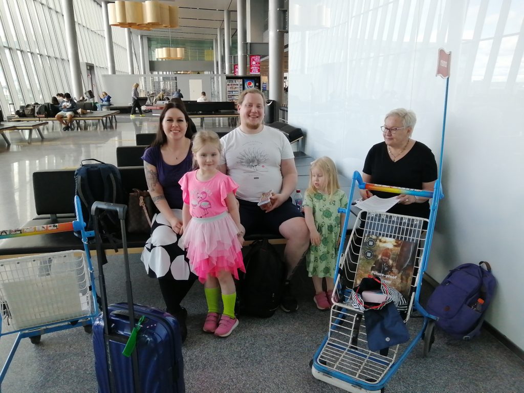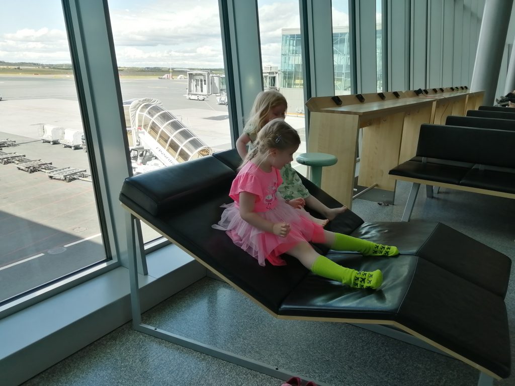 Pääsimme ensimmäistä kertaa kokemaan Helsinki-Vantaan uuden lähtöaulan, jossa oli kyllä kansainvälistä fiilistä ihan eri tavalla kuin aiemmassa. Kun mummi liittyi alakerrasta meidän seuraan, porukkamme oli kasassa. Antti oli tehnyt lähtöselvityksemme ensimmäiselle lennolle jo kotona ja nyt taiteilimme automaatista ruumalaukkujen kohdetarrat. Yhdysvaltoihin oli ihan oma Finnairin tiskinsä, jossa jätimme laukut. Boardingeja emme kuitenkaan saaneet perille asti, vaan Losissa olisi laukkujen siirtämisen lisäksi tehtävä lähtöselvitys kokonaan alusta domestic-lennolle. Helsinki-Vantaalla turvatarkastusta oli helpotettu valtavasti, sillä elektroniikkaa (läppäriä, kameroita, puhelimia, roonia) ja nesteitä ei tarvinnut poistaa enää laukusta läpivalaisun ajaksi. Ostimme nallenamut ja fazerin suklaata tax freestä. Vaikka aikaa ei ollut mitenkään liikaa, ehdimme portin vieressä vähän rentoutua. Mila ja Aava olivat riemuissaan uusista semipehmeistä lepoistuimista ja keinutuolista.