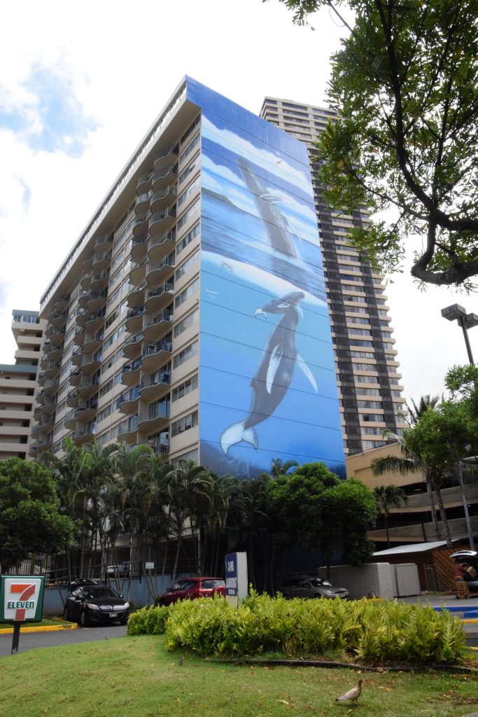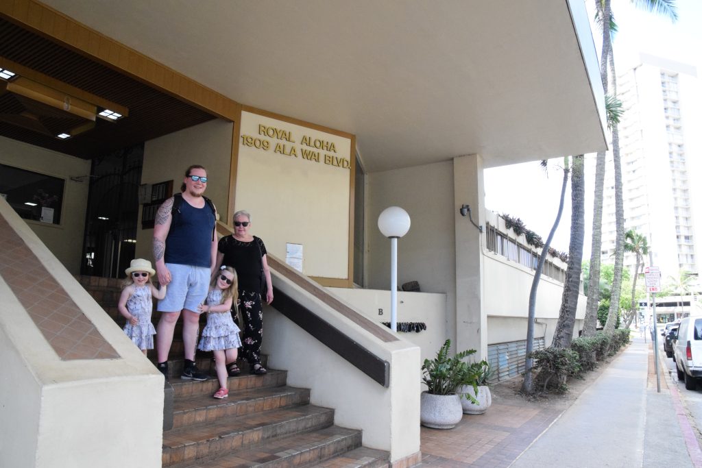 Laukutkin olivat ehtineet meidän koneeseen ja sitten tarvitsi vain löytää taxi. Astuimme Hawaiin lämpimään kosteaan, mutta ei tuskaisen kuumaan ilmaan. Iso taxi oli valmiina parkissa ja mahduimme siihen kaikki kyllin hyvin. AirBnb-kotimme oli Ala Wain varrella ”valastalossa” (, talossa, jonka yhdellä ulkosivulla on valtava valasmaalaus). Hankaluudet eivät olleet vieläkään loppuneet, sillä meillä oli ohjeista huolimatta vaikeuksia päästä sisään. Emme ensin löytäneet numerokoodillisia laatikoita, joista kulkulätkät piti ottaa ja oli epäselvyyksiä mihin milläkin koodilla piti päästä. Kulkulätkillä päästiin sisään eteiseen ja ovikoodilla luonnollisesti 8 kerroksessa sijaitsevaan kolmioomme. Vaikka meidän makkari oli aika pieni, sain vaatteet ja kamat aseteltua sinne nätisti ja matkalaukun vaatekaapin sisään. Mummi ja lapset asettuivat isompaan makkariin, jossa oli parisängyn lisäksi lapsen sänky, johon Aava meni. Antti kävi 7elevenissä hakemassa ilta- ja aamupalaa. Sieltä tuli mm. ihan kelpoburritot ja vaniljajugua. Onneksi olin nukkunut lentokoneissa, väsymys ei ollut valtaisa. Jaksoin hyvin suihkuttaa tytöt ja itseni. Mila kysyi miksi ei ole sadesuihkua. Tytöt ovat kyllä tottuneet liian hyvään ja hienoon meidän uudessa kodissa. Ensimmäinen ilta pitkän matkan jälkeen tuntui juurikin siltä, miltä yleensäkin lasten kanssa matkustamisen jälkeen. Pää vähän sekaisin ja pientä ahdistusta uudesta paikasta. Miksi tulimme tänne, kotona olisi paljon mukavampaa ja helpompaa? Mutta me molemmat tiesimme, että huomenna mieli muuttuisi. Nyt vain nukkumaan, jotta pääsemme nopeammin Hawaii-fiilikseen.