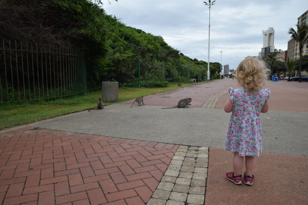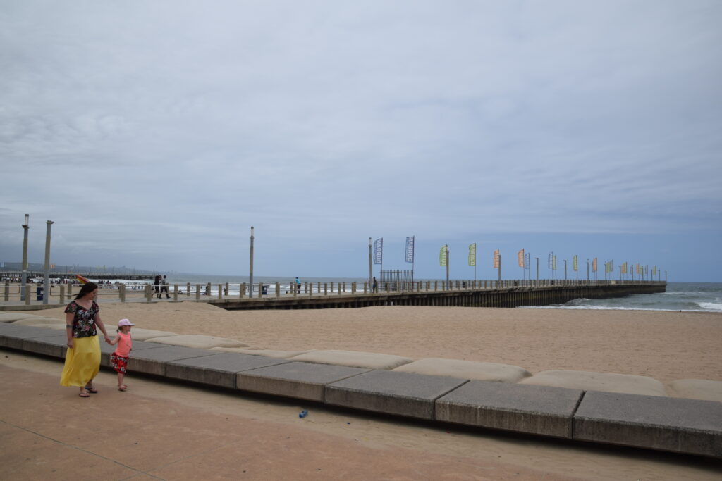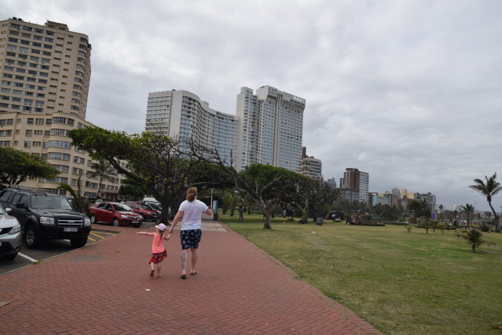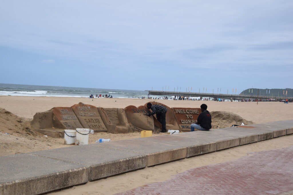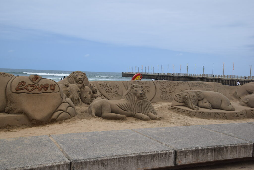Ensimmäisenä päivänämme Durbanissa lähdimme tutustumaan rantabulevardiin, jonka varrella asuimme. Mukavan leveä kivetty kävelytie reunusti pitkää Golden Mile biitsiä. Ravintoloita oli jonkin verran pitkin. Useimmat olivat pikaruokaketjuja, kuten Wimpy’s, Steers tai Fishaways tai pieniä ja ahtaan tuntuisia ravintoloita, jotka eivät kutsuneet meitä viihtymään. Kadun toisella puolella oli hotelleja, joista osa näytti sulkeneen ovensa mahdollisesti koronan takia. Hiekalle oli tehty taidokkaita hiekkalinnoja ja -veistoksia. Safarieläimet hiekasta veistettynä olivat kaikista hienoimmat. Rannalla oli pitkälti tyhjää, mutta välillä oli valtavia ihmisryppäitä uimassa yhdessä kohdassa. Niiden lisäksi muutama yksinäinen surffaaja oli meressä tai meni laudan kanssa kohti sitä. Arviolta 95 % ihmisistä oli tummaihoisia. Täällä on paljon myös hinduja ja muslimeita, mikä näkyi katukuvassa. Souvenir-kojuja oli pitkin rantakatua ja siellä oli myynnissä mm. sandaaleja, värikkäitä shortseja, puuveistoksia ja koruja. Joitakin kerjäläisen tapaisia tuli vastaan, jotka pyysivät ruokaa perheelleen.