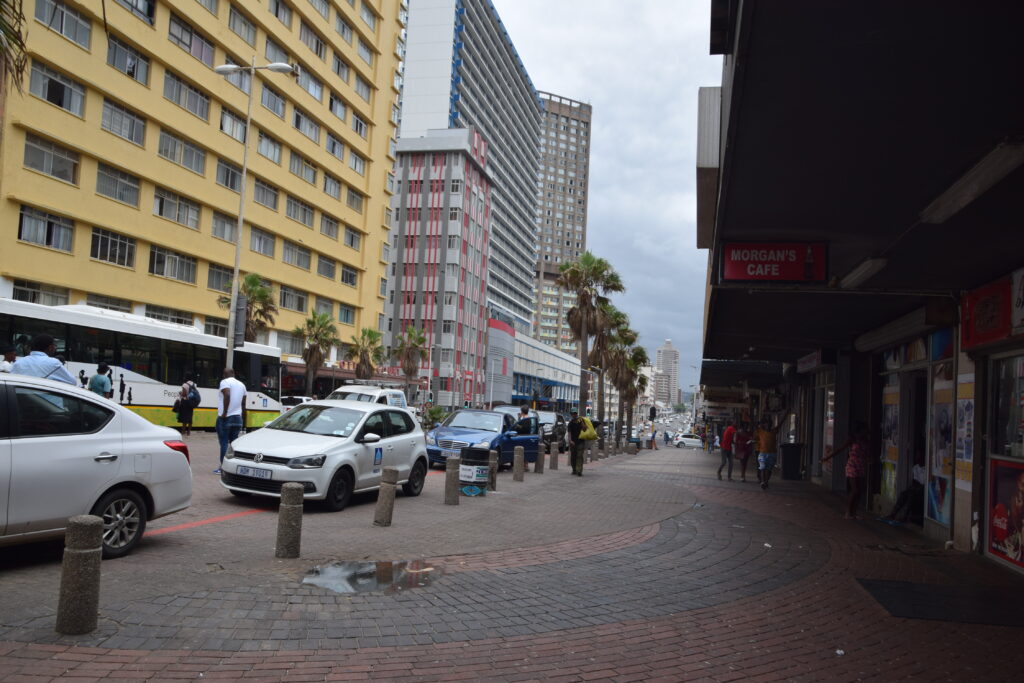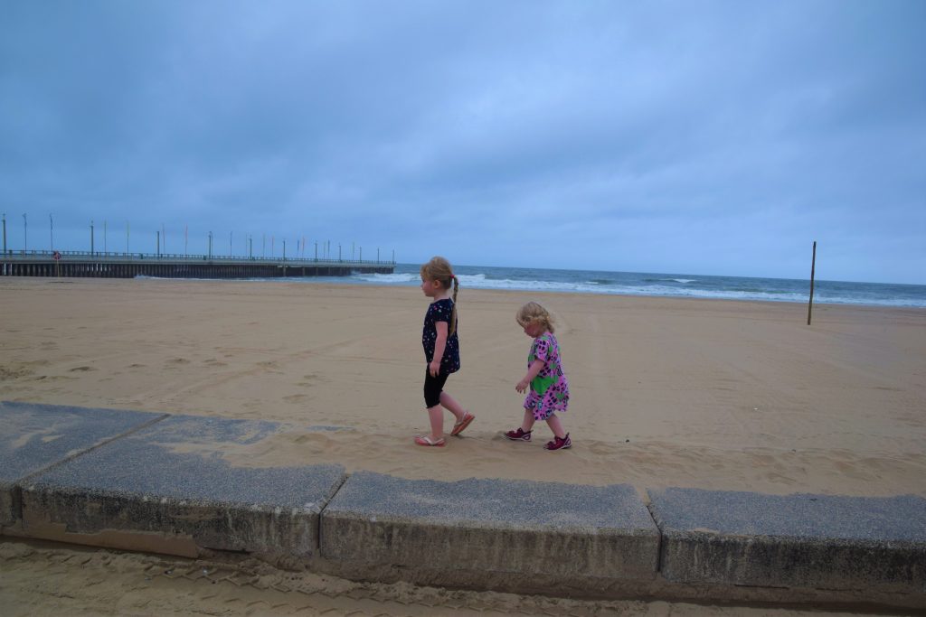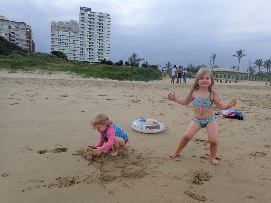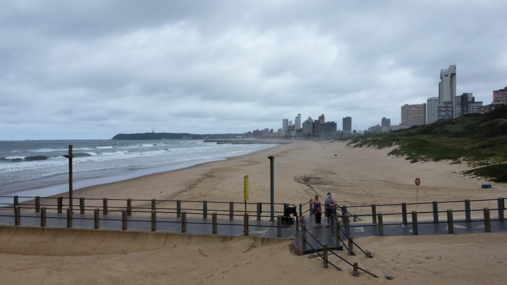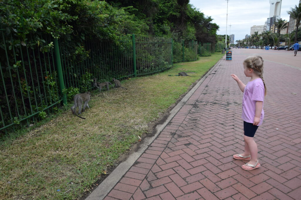 Ensimmäisenä päivänämme Durbanissa lähdimme tutustumaan rantabulevardiin, jonka varrella asuimme. Mukavan leveä kivetty kävelytie reunusti pitkää Golden Mile biitsiä. Ravintoloita oli jonkin verran pitkin. Useimmat olivat pikaruokaketjuja, kuten Wimpy’s, Steers tai Fishaways tai pieniä ja ahtaan tuntuisia ravintoloita, jotka eivät kutsuneet meitä viihtymään. Kadun toisella puolella oli hotelleja, joista osa näytti sulkeneen ovensa mahdollisesti koronan takia. Hiekalle oli tehty taidokkaita hiekkalinnoja ja -veistoksia. Safarieläimet hiekasta veistettynä olivat kaikista hienoimmat. Rannalla oli pitkälti tyhjää, mutta välillä oli valtavia ihmisryppäitä uimassa yhdessä kohdassa. Niiden lisäksi muutama yksinäinen surffaaja oli meressä tai meni laudan kanssa kohti sitä. Arviolta 95 % ihmisistä oli tummaihoisia. Täällä on paljon myös hinduja ja muslimeita, mikä näkyi katukuvassa. Souvenir-kojuja oli pitkin rantakatua ja siellä oli myynnissä mm. sandaaleja, värikkäitä shortseja, puuveistoksia ja koruja. Joitakin kerjäläisen tapaisia tuli vastaan, jotka pyysivät ruokaa perheelleen.