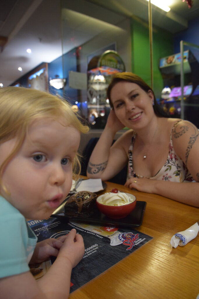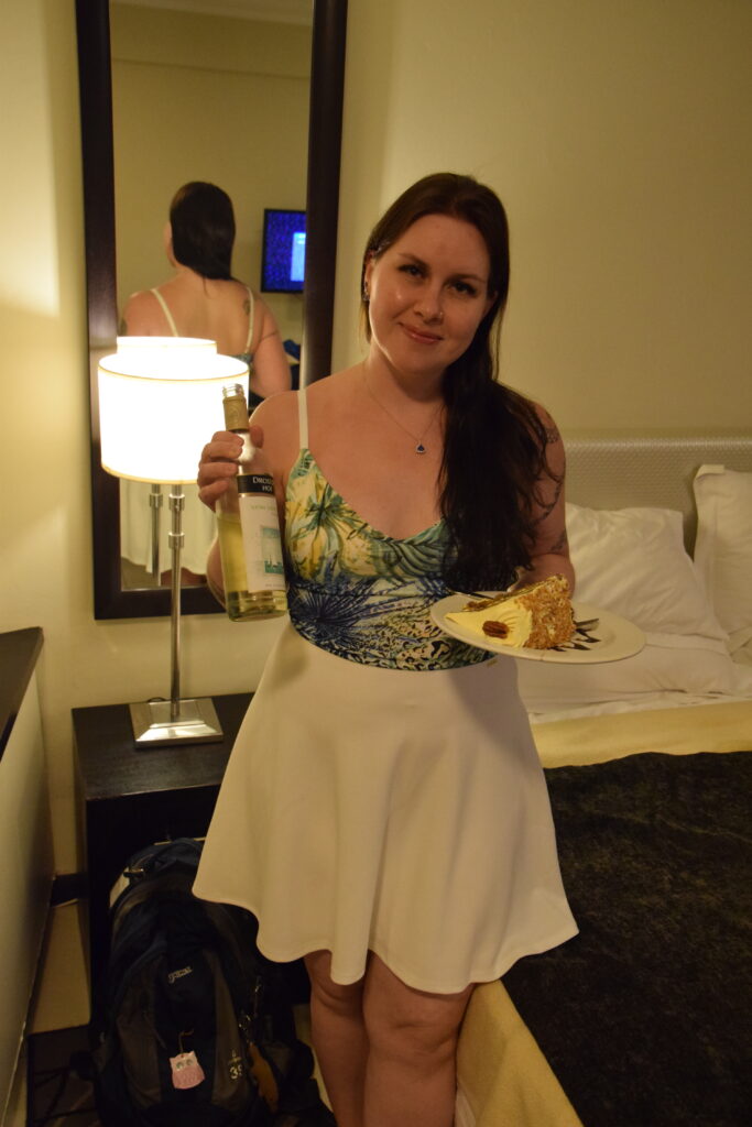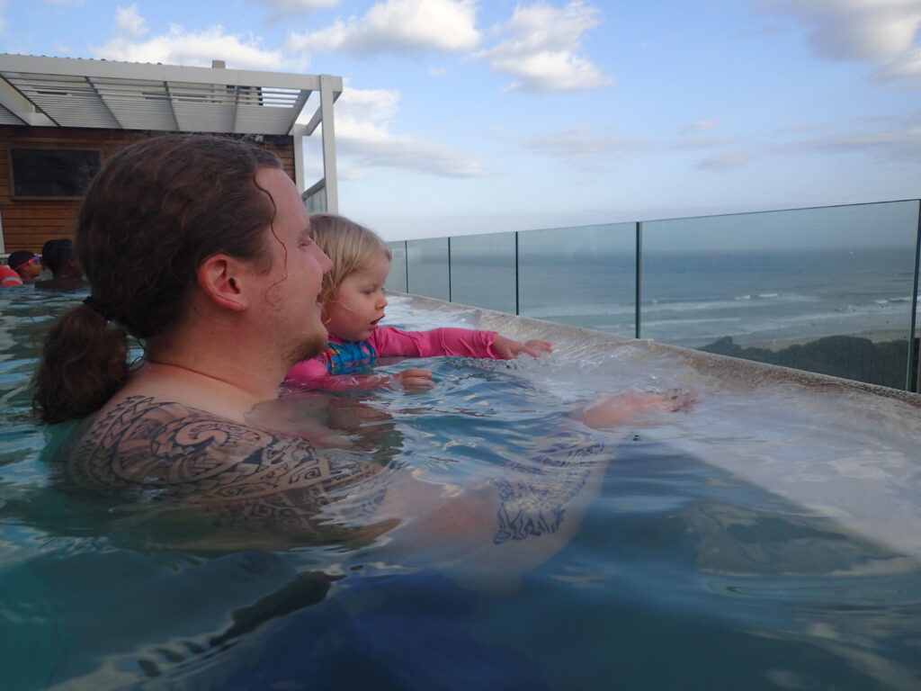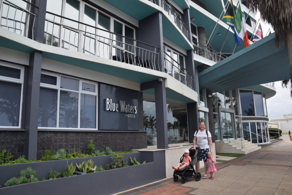 Blue Watersissa (North Beachillä) meillä oli pieni kaksio (188 €/yö). Tyttöjen huone oli hyvin pieni, mutta saimmepa heidät ainakin omaan huoneeseen nukkumaan. Buffet-aamiainen kuului hintaan. Pääsimme päivittäin hyvin käyntiin munakkaalla ja muilla lämpimillä aamiaistuotteilla. Paitsi eivät lapset, jotka tottakai nirsoilivat aamuisin. Aamiaisjälkkäriksi sai hakea vohvelia suklaakastikkeella. Toisin kuin Cape Townin hotellissamme, täällä riitti porukkaa. Aamiaisella populaa oli turhankin paljon. Joinakin aamuina sinne jonotettiin. Sama ravintola toimi myös lounas- ja päivällisravintolana. Hyvää ruokaa, mutta medium-pihvit olivat lähes aina well done. Meillä ei netti yleensä toiminut huoneessa, joten nettiasioissa olimme välillä alakerran loungessa. Se oli kyllä viihtyisä ja toisin kuin ravintola aamiaisaikaan, hyvin rauhallinen.