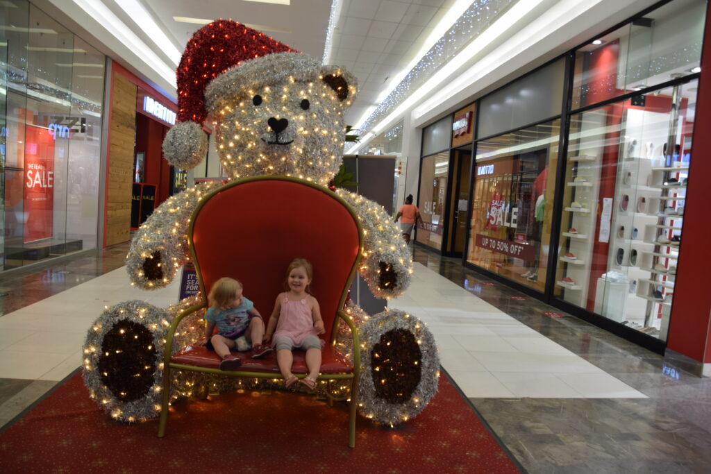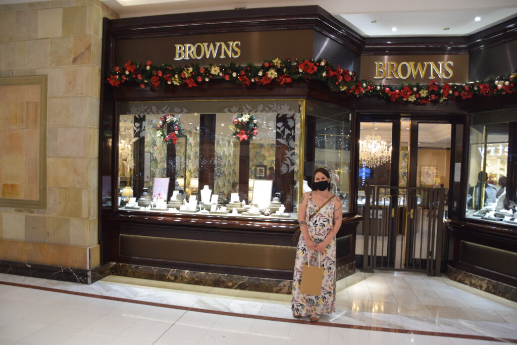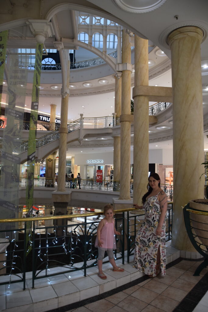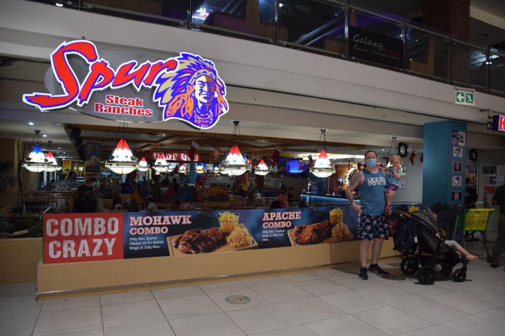 Kiertely kaupungin keskustassa ei enää houkuttanut. Suuntasimmekin pikkushoppailuille kaupungin laidalle, Westwillessä sijaitsevaan Pavilioniin. Ulkoa mall oli kuin paviljonkikylä ”paviljonkitorneineen”. Auto saatiin näppärästi parkkihalliin.  Sitten vain shoppailemaan. Viileä tuulahdus tuli vastaan heti sisällä, ihanaa. Sisältä Pavilion oli mukavan hienostuneesti sisustettu, marmoripylväineen ja vaaleansinisine jouluvaloineen. Siellä viihdyimme. Food Courtista löytyi myös meille nostalginen Spur -ravintola(ketju). Olimmekin odottaneet, että pääsemme taas Spuriin pihville, tällä kertaa strutsille. Ravintoloissa oli 50 hengen rajoitus. Tämän vuoksi joihinkin ravintoloihin joutui jonottamaan jonkin aikaa.