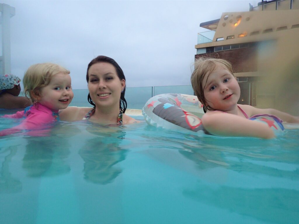 Iltapäivällä laitettiin uikkarit päälle ja mentiin kadun toiselle puolelle biitsille. Tytöt tekivät pieniä ”hiekkalinnoja” (hiekkakökköjä). Kävin Milan kanssa vähän meressä pomppimassa aalloissa. Ranta oli kuitenkin menossa kiinni ja rantavahdit tulivat siitä informoimaan jokaiselle yksitellen. Viiden jälkeen ei siis saanut olla enää rannalla. Mistä tälläistäkään olisi voinut tietää? Tulimme rantasuihkun kautta omalle kattoaltaalle. Pienessä uima-altaassa oli paljon porukkaa. Ja koronan huomioon ottaen hiukan ahdistavaa, melkoinen koronalinko jos jollain se on.
