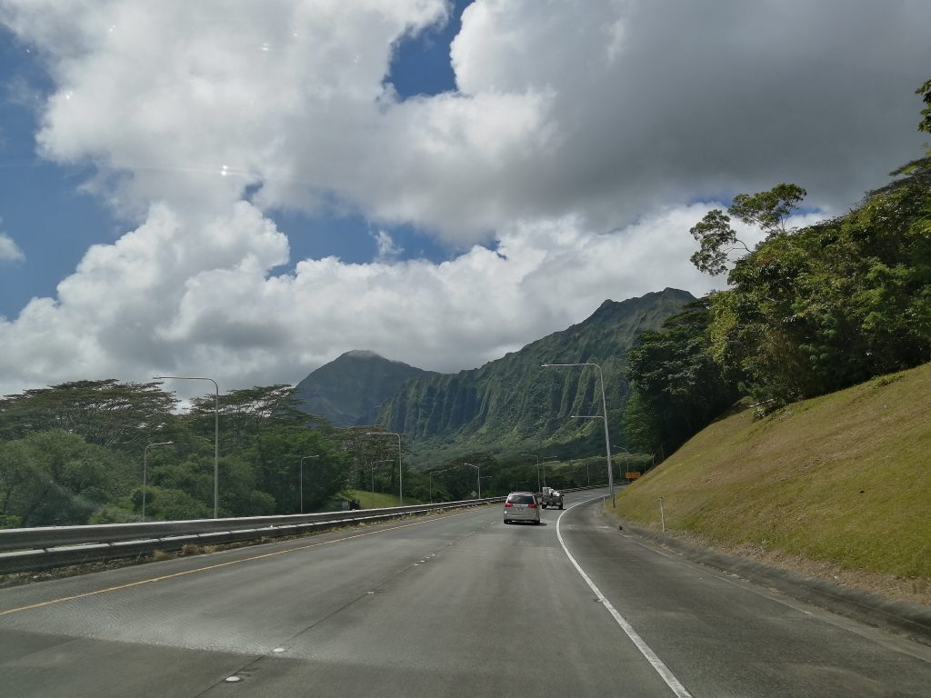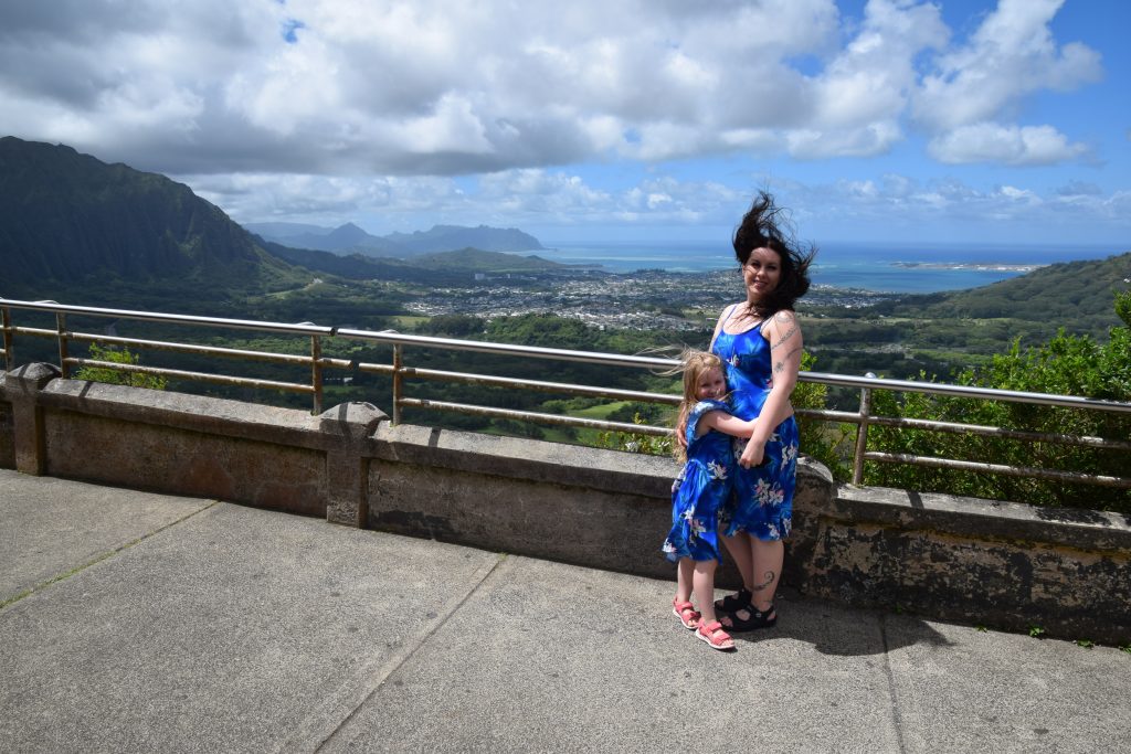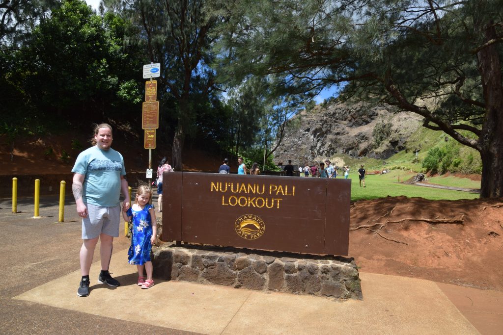 Seuraavaksi googlemapsiin laitettiin Nu’uanu pali lookout. 20 minuutin matkalla Aava ehti simahtaa päikkärille. Olimme myös löytäneet oikean radiokanavan, sen Hawaii reggae -kanavan, jota aina kuuntelemme täällä autossa. Lookoutilla tuuli valtavasti, se on vuorten rinteiden välissä tuulitunnelissa. Se sai tytöt riemastumaan ja kikattamaan.