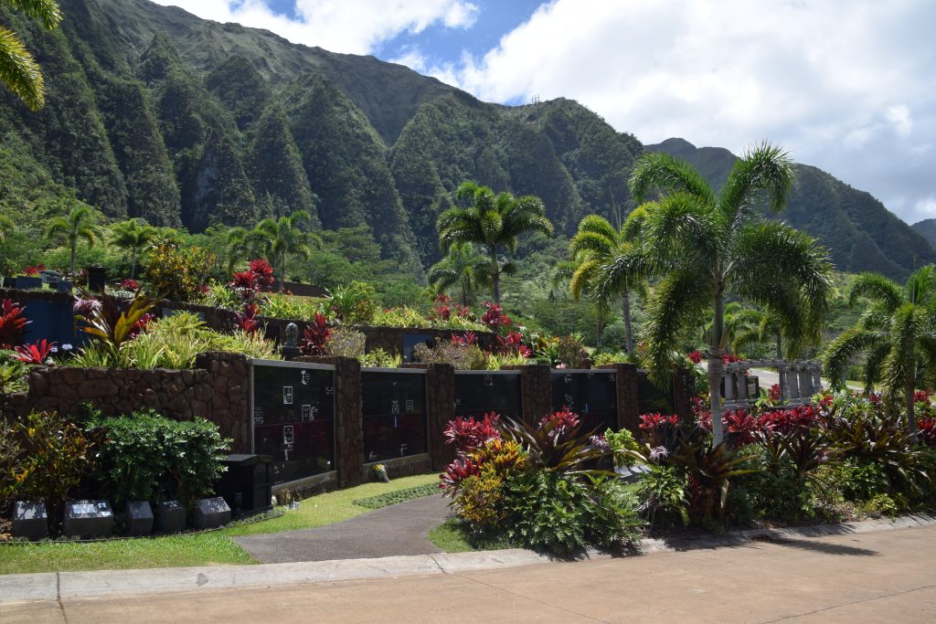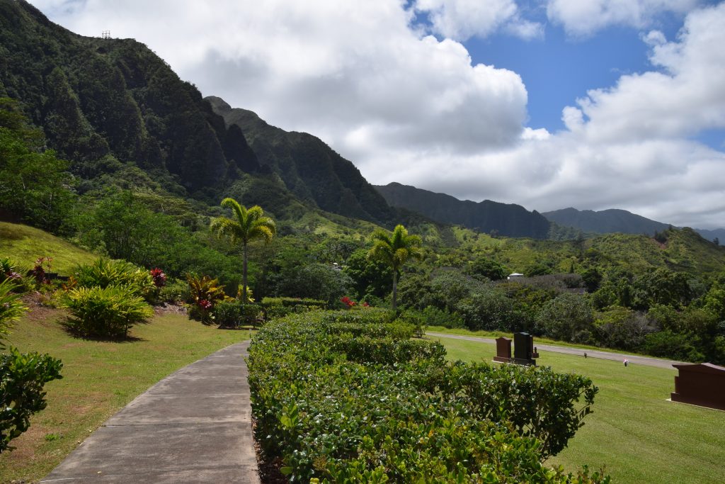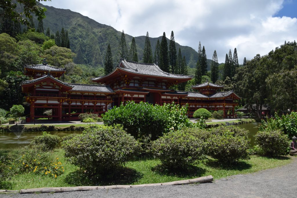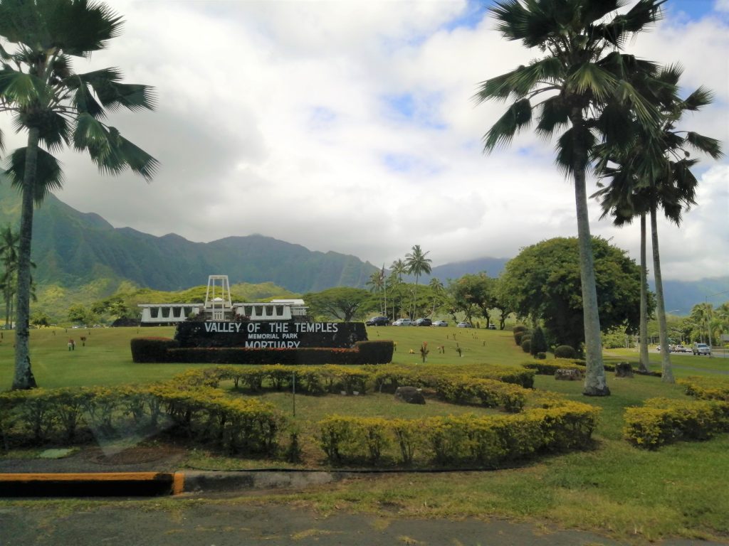 Valley of the Temples on Ko’olau vuoriston juurella. Vuoren poimut kohoavat kauniisti laakson takana. Alue koostuu suurelta osin kauniisti hoidetusta hautausmaasta. Eri uskontojen ihmisiä on haudattu sinne omille alueilleen. Blessed mother -patsas on siellä kristittyjen hautojen ympäröimänä. Omalla rinteellään kohosivat myös japanilaisten säntillisissä riveissä olevat hautakivet. Tämän alueen päänähtävyys on kuitenkin Byodo In, vuonna 1968 rakennettu,  moniuskonnollinen temppeli, jonne oli aikuisilta 5 dollarin pääsymaksu. (Lapset olivat ilmaisia.) Byodo tarkoittaa tasa-arvoista ja in temppeliä. Temppelialueelle johti kaareva silta ja pian olikin fiilis kuin Aasiassa. Temppelin vieressä oli valtava kello, jota sai isolla puupötköllä (shumoku) kumauttaa. Temppeliin mennessä otettiin kengät pois. Sisältä löytyi iso istuva Buddha ja suitsukkeista tuleva ihana tuoksu, joka toi Antille mieleen Bora Boran hyttyssavut. Aluetta ympäröi lampi, jossa ui karppeja. Osa niistä oli valtavia oranssipunaisia vonkaleita, jotka saivat lapset innostumaan. Karppilaumojen lisäksi tapasimme suojaisammassa lammen osassa parittelevan sammakkopariskunnan.