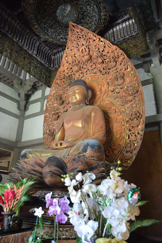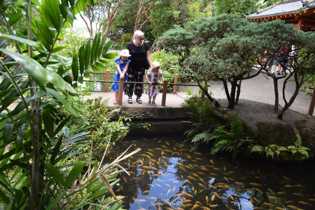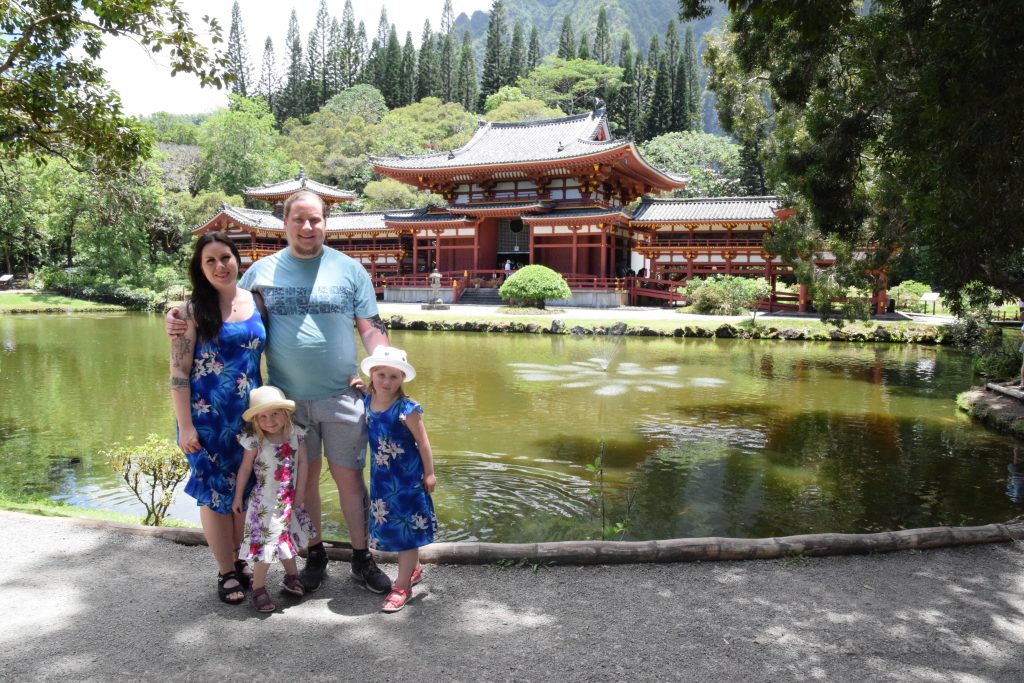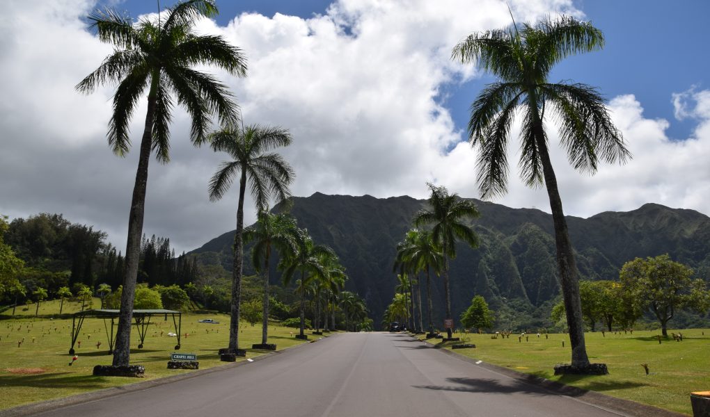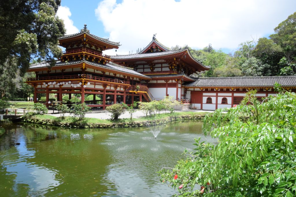 Valley of the Temples on Ko’olau vuoriston juurella. Vuoren poimut kohoavat kauniisti laakson takana. Alue koostuu suurelta osin kauniisti hoidetusta hautausmaasta. Eri uskontojen ihmisiä on haudattu sinne omille alueilleen. Blessed mother -patsas on siellä kristittyjen hautojen ympäröimänä. Omalla rinteellään kohosivat myös japanilaisten säntillisissä riveissä olevat hautakivet. Tämän alueen päänähtävyys on kuitenkin Byodo In, vuonna 1968 rakennettu,  moniuskonnollinen temppeli, jonne oli aikuisilta 5 dollarin pääsymaksu. (Lapset olivat ilmaisia.) Byodo tarkoittaa tasa-arvoista ja in temppeliä. Temppelialueelle johti kaareva silta ja pian olikin fiilis kuin Aasiassa. Temppelin vieressä oli valtava kello, jota sai isolla puupötköllä (shumoku) kumauttaa. Temppeliin mennessä otettiin kengät pois. Sisältä löytyi iso istuva Buddha ja suitsukkeista tuleva ihana tuoksu, joka toi Antille mieleen Bora Boran hyttyssavut. Aluetta ympäröi lampi, jossa ui karppeja. Osa niistä oli valtavia oranssipunaisia vonkaleita, jotka saivat lapset innostumaan. Karppilaumojen lisäksi tapasimme suojaisammassa lammen osassa parittelevan sammakkopariskunnan.