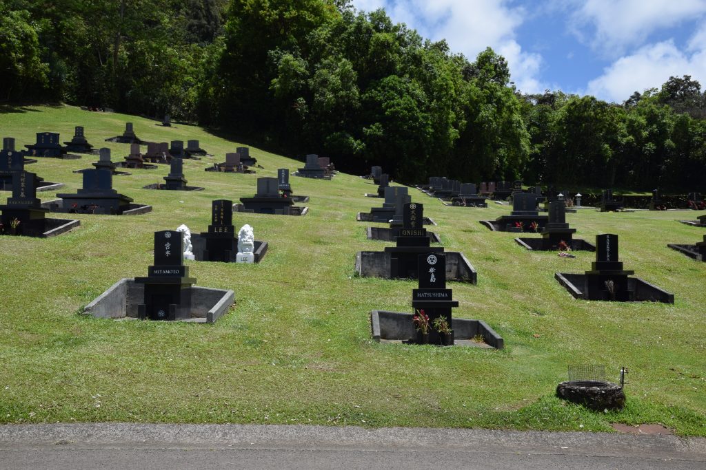 Temppelialueen vieressä rinteessä oli kiinalaisten hautoja. Tämä ns. Ocean view terraces tarjosikin hienot maisemat Kaneohen lahteen. Ajelimme sen läpi ja pistäydyin ulos autosta ottamaan parit fotot.