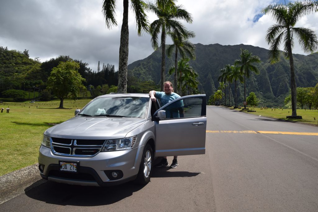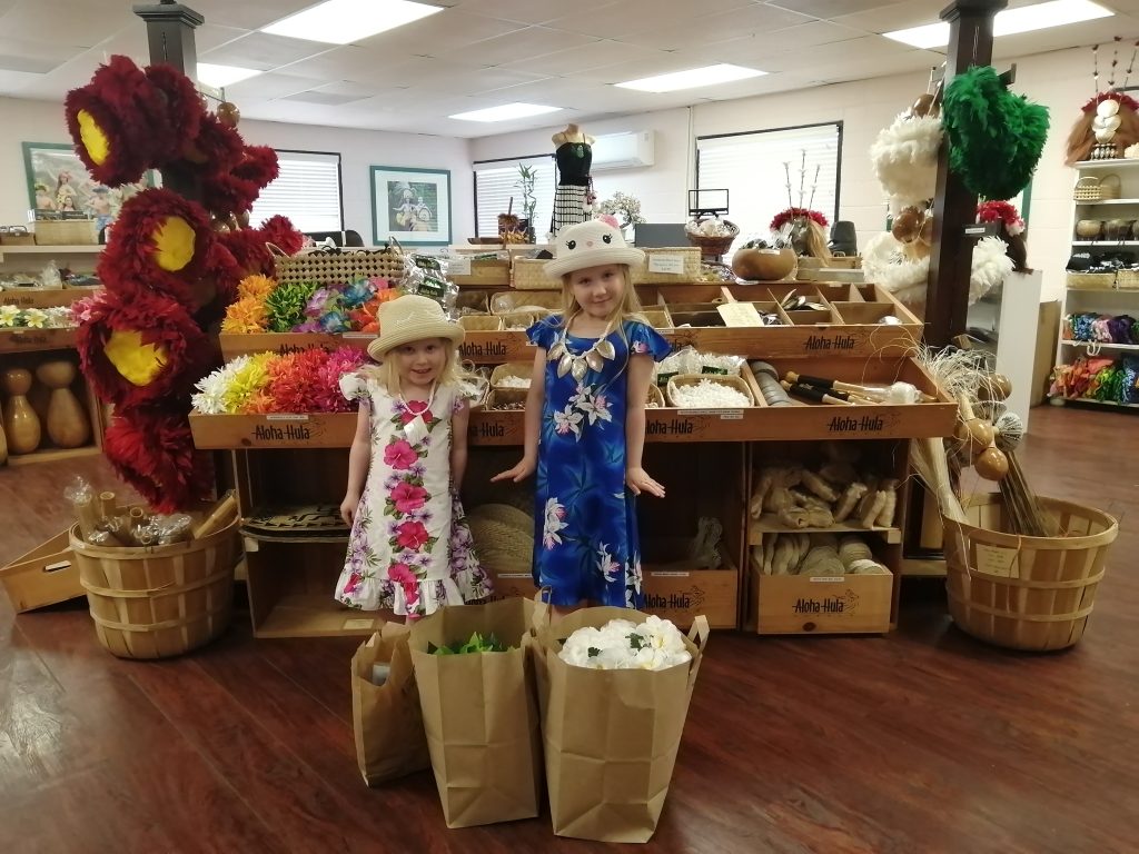 O’ahulla vuokrasimme auton yhdeksi päiväksi. Antti lähti muutaman korttelin päästä hakemaan vuokra-autoa. Sillä aikaa minä laitoin päiväretken pakkaukset valmiiksi. Klo 9.30 olimme alhaalla, jonne Antti oli tullut harmaalla Dodge Journey -katumaasturilla. Oli mahtavaa päästä ilmastoidun ”oman” auton kyytiin muutaman kävellen hikoillun päivän jälkeen. Antti oli hankkinut puhelimeensa pre payd -reissunetin. Pian huomasimme, että ilman sitä emme olisi pärjänneet autoillessa. Ensimmäinen kohteemme oli Aloha Hula Supply Pearl Harborin läheisyydessä Lawehana streetillä. Aloha Hula Supply oli muuttanut 10 vuoden takaisesta pikkuputiikista isompiin tiloihin pois ydinkeskustasta. Sen yhteydessä oli myös liikkeen tehdas, jossa valmistettiin tällä hetkellä ipu heke -rumpuja ja uli uli –”marakassihuiskia”. Minulla oli lista mitä kaikkia ja kuinka monta pinkkiä, punaista, valkoista ja vihreätä leitä ja seppelettä meidän tanssijat tarvitsevat. Yhdelle kaislahameellekin olisi ollut tarvetta, mutta niitä ei ollut varastossa lainkaan. Monista leistä otin kaikki viimeistä kappaletta myöten ja ostettavaa kertyikin aikamoinen kasa. Tytöt innostuivat valitsemaan itselleen simpukkakaulakoruja. Ihania hiuskukkia oli myös katseltava ja parit sieltäkin tarttui mukaan, minulle ja tytöille.