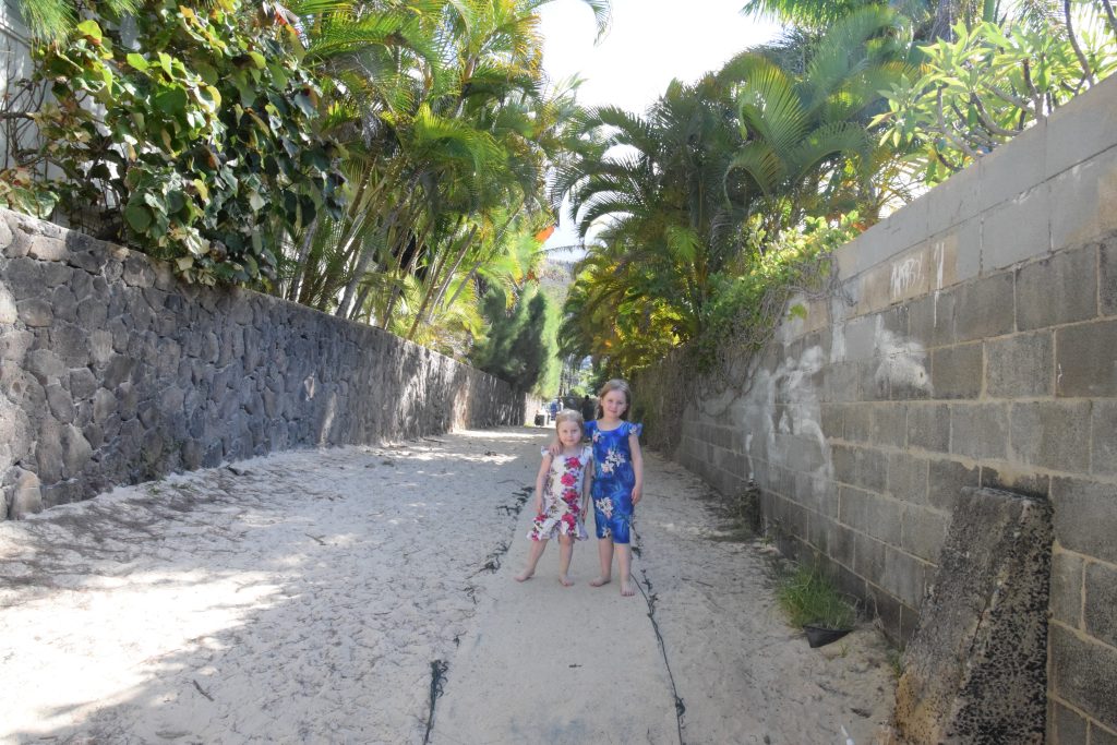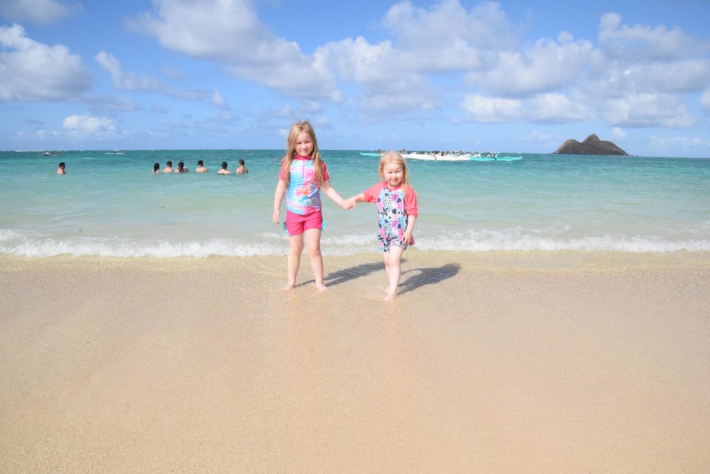 Sitten kohteeksi laitettiin Lanikai Beach, tämän saaren kuulemma kaunein ranta. Sinne ajettiin Kailuan läpi, jossa pysähdyimme mäkkiin vessatauolle ja pehmiksille. Lanikaihin johdatti matoilla päällystetty hiekkatie mukavan näköiseltä asuinalueelta, jossa oli viihtyisän näköisiä matalia omakotitaloja. Biitsi oli erinomainen ja suosittu. Ei mikään suuren suuri. Hiekka oli valkoista ja pehmeää, vesiraja virheetön ja meri turkoosin ja sinisen sävyissä. Minä menin lasten kanssa uimaan. Vaikka Mila oli Suomessa sanonut, ettei halua uida meressä, niin kyllä hän täällä innostui. Rantaan tulevat aallot olivat juuri sopivan kokoisia, jotta tytöt voivat leikkiä niissä. Kauempana mentiin outriggereillä ja jotkut snorklasivat. Tytöt eivät millään tahtoneet pois merestä, kun olivat päässeet aaltojen makuun.