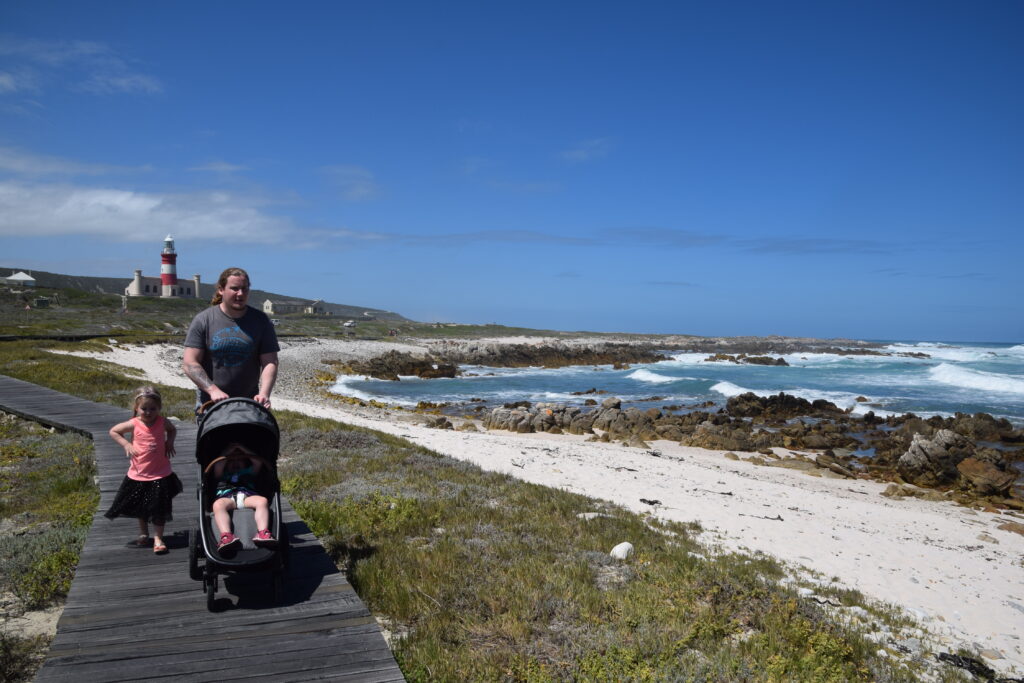 Noin kolmen tunnin ajomatka päättyi L’Agulhasin pieneen kaupunkiin. Siinä kohtaa oli jo kiire vessatauolle. Juuri kun ehdin toivoa vessan kävelevän vastaan, Public toilet ilmestyi ihan viereen. Vessan löytäminen voi välillä olla hyvinkin näppärää. Milakin kävi kiltisti taas vessassa, kun äiti näytti ensin mallia. Houkuttelevan näköiset kalaravintolat näyttivät hyviltä lounaspaikoilta tälle päivälle. Mutta ensin päänähtävyyteen, vielä piti löytää se eteläisin piste. Meillä ei ollut ihan varmuutta siitä, mutta kaupungin laidalla oleva punavalkoinen majakka oli varmasti sitä lähellä. Lähdimme siis kävelemään sinne päin.