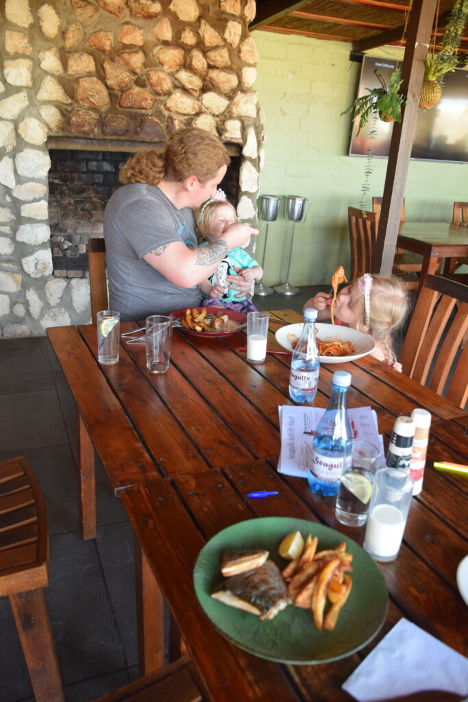 Pientä jonoa monumentille oli, mutta ei mitään häiritsevää tungosta. Muutama ihminen oli samaan aikaan paikalla. Palasimme autolle ja sillä sitten minuutissa Agulhasin keskukseen. Menimme aattolounaalle Seagully-ravintolaan toiseen kerrokseen, josta näkyi merelle. Odotellessa lapset saivat tarjoilijalta väritystehtävän ja kyniä. Minä otin päivän kalaa, Antti pihviä ja tytöt jakoivat spagettiannoksen. Spagetti kului vaihtelevalla menestyksellä. Jälkkäriä saatiin odotella, mutta jätski olikin sitten toki suuri hitti meidän pöydässä.