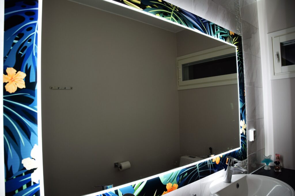 Saimme odottaa yläkerran vessan peiliä jonkin aikaa, koska tarvitsimme sen asentamiseen sähköhenkilöä. Olimme tilanneet peilin Artformalta jo ajoissa syksyllä. Muut wc-kalusteet olivat tulleet Puustellista, mutta he eivät toki eri firman peiliä lähteneet asentamaan. Tammikuussa tuo niin meidän näköinen peili saatiin vihdoin asennettua, kun saimme sovittua sähkärin paikalle.