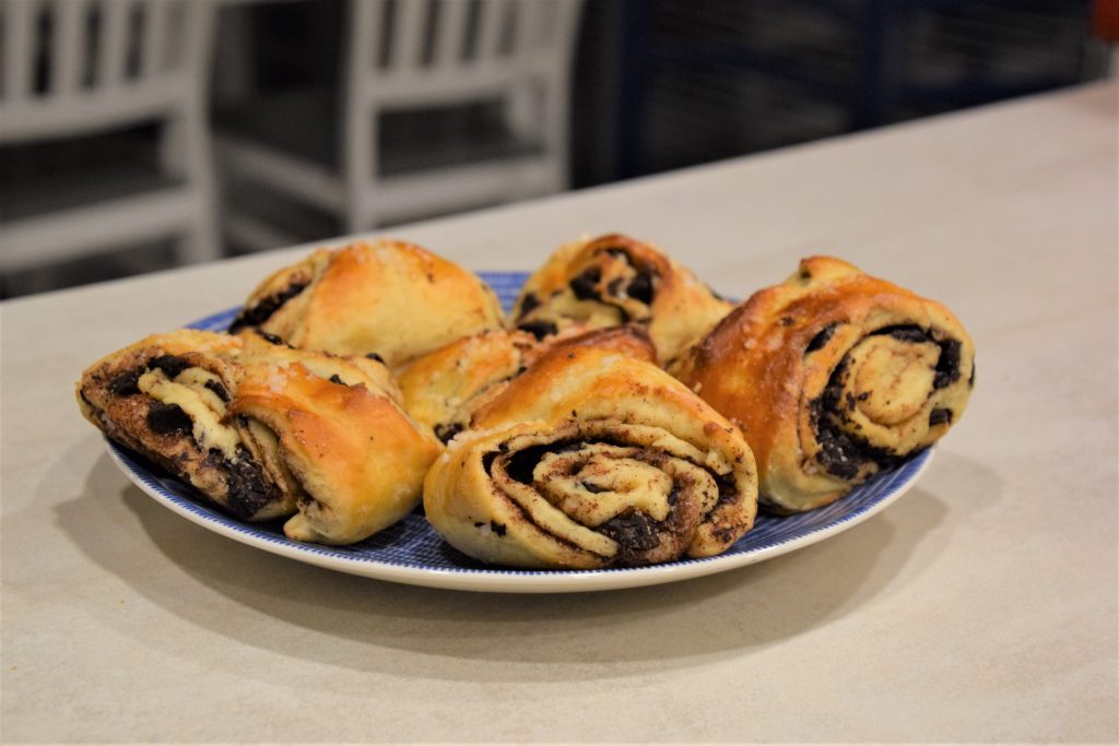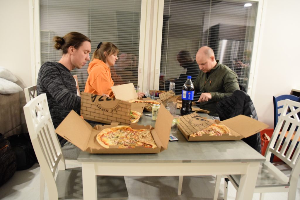 Kun suurin osa omaisuudesta oli tuotu, oli muuttajien ruokkimisen aika. Pizzat tilattiin Vuoresin Rok ravintolasta. Minä olin huolehtinut jälkkäristä jo pari viikkoa sitten. Olimme Aavan kanssa leiponeet ison satsin muuttopullia pakkaseen eli herkkukorvapuusteja, joissa on suklaata mukana.