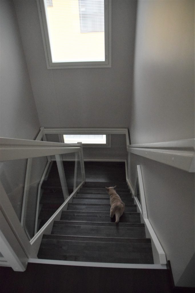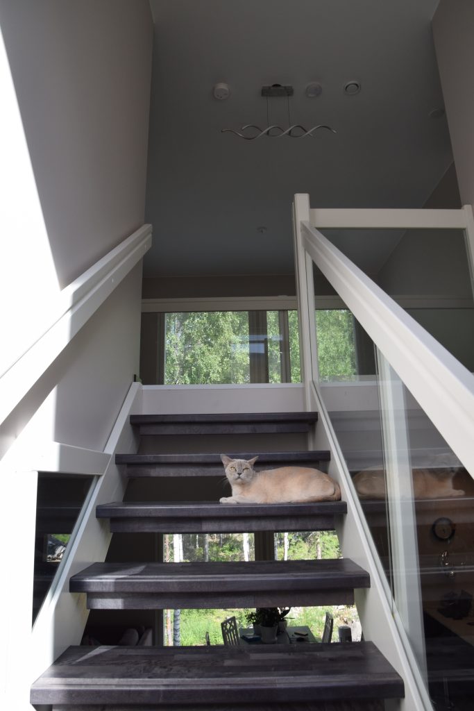 Seuraavana päivänä heräsimme siihen, kun kissat, jotka oli laitettu eilen yhteen huoneeseen, olivat avanneet oven ja aloittaneet tutustumisen uuteen kotiinsa. Tiare kömpi makuuhuoneeseen meidän sänkyyn. Vaikka muutto, ainakin Pualle, oli ollut stressaava kokemus, niin kissat tuntuivat sopeutuvan uuteen kotiin hetkessä. He tutkivat paikat läpi ja asettuivat asumaan, ihan kuin mitään muutosta ei olisi tapahtunut. Eniten kissat tuntuivat nauttivat meidän yläaulasta. Lasikaiteen vierestä on hienot maisemat alakertaan ja isojen ikkunoiden kautta ulos.
