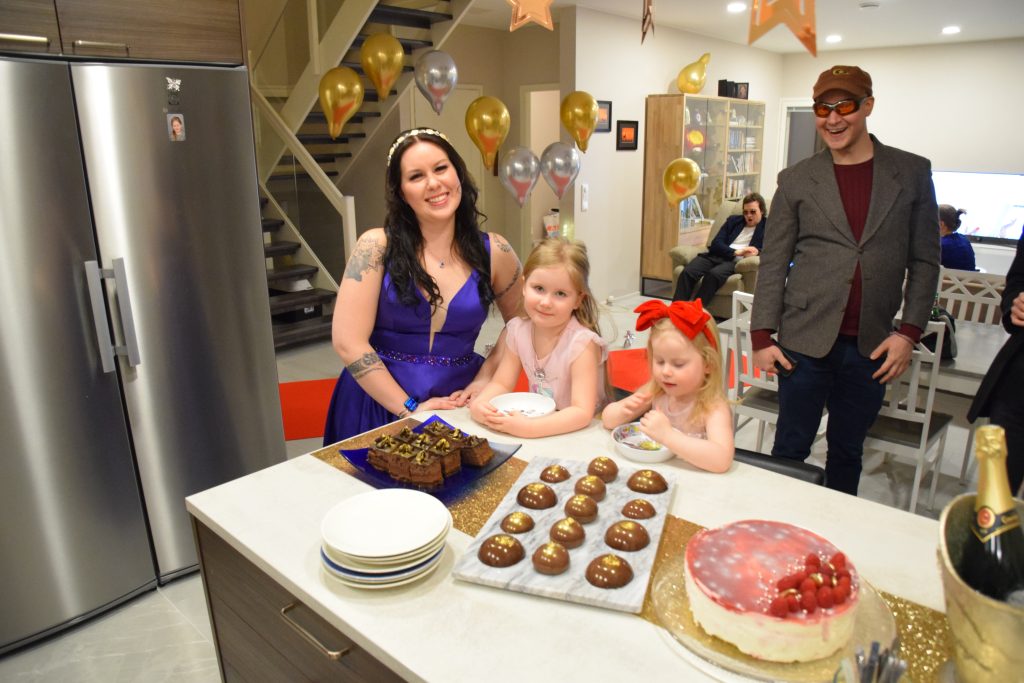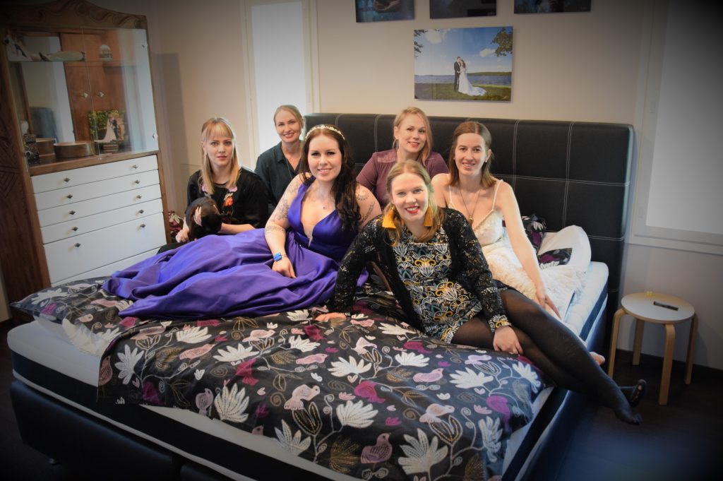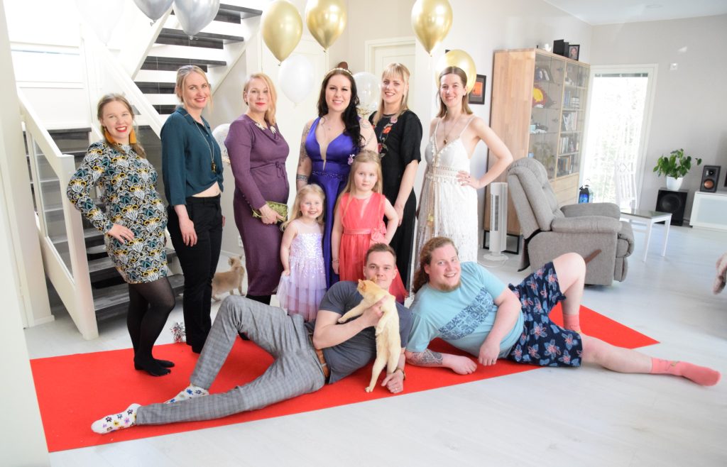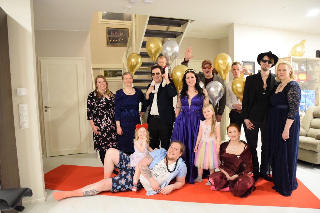 Olen päässyt nauttimaan keittiön ”leipomissaarekkeesta” jo monet kerrat. Siinä on ehditty loihtia jo monta kakkua ja herkkua. Aluksi se oli myös minun ”työpöytäni”, kun omani oli vasta matkalla Suomeen. Vietimme ensimmäisiä tupareita helmikuussa Vuores Gaala -teemalla. Tarkoitus oli pukeutua kuin Oscar Gaalan punaiselle matolle, sillä pitkä punainen matto oli todellakin hankittu. Levonnaisia koristivat mm. syötävä lehtikulta ja hopeaspray.
