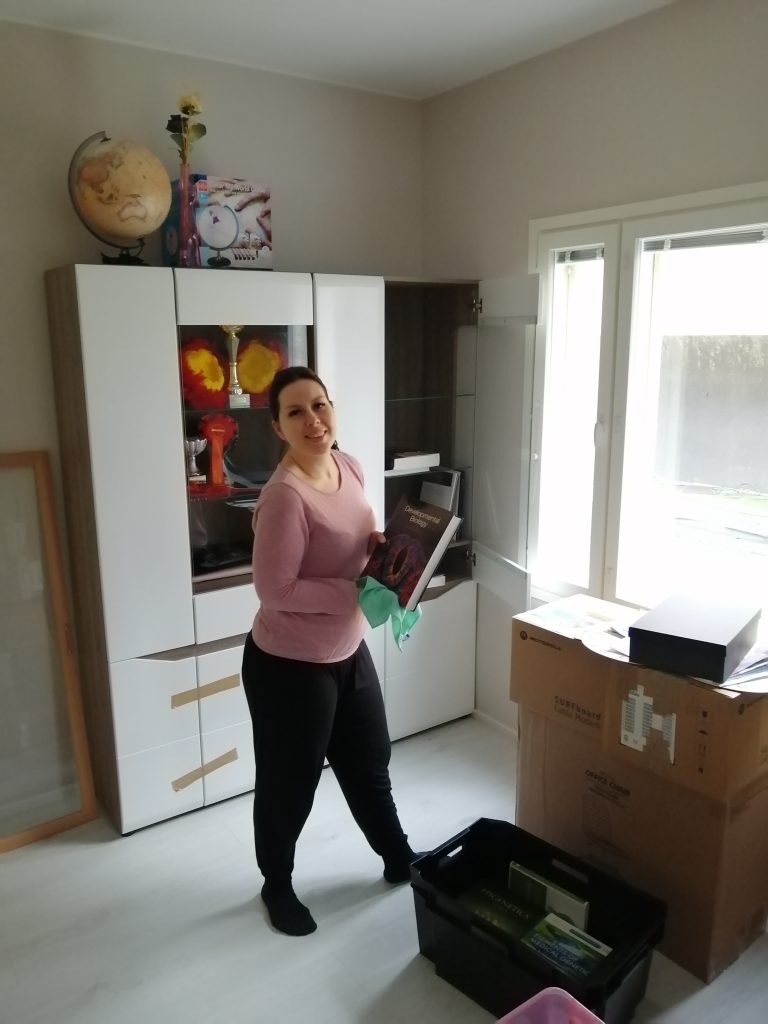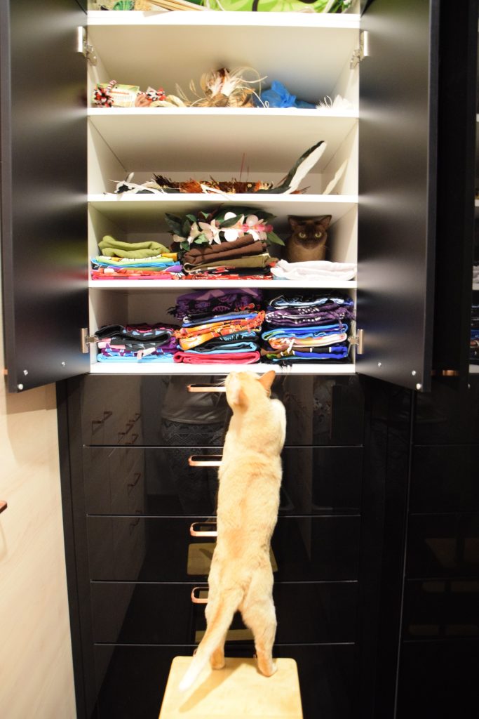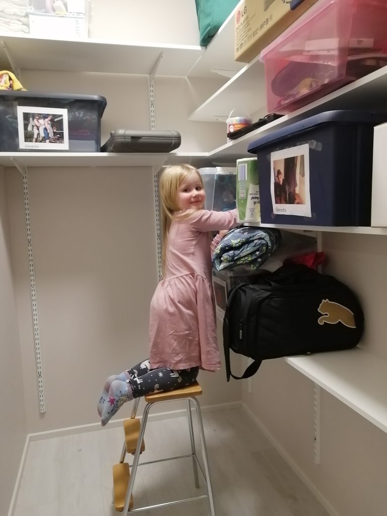 Huonekalujen kanssa muuttolaatikot sulautuivat uskomattoman hyvin uuteen kotiin. Missään vaiheessa ei tuntunut siltä, että olisi ahdasta missään huoneessa. Pua aiheutti jännitystä kesken muuton, kun olimme pakanneet jo muut kissat bokseihin. Häntä ei löytynyt mistään ja pelästyin, että hän oli karannut ulos ulko-oven ollessa välillä auki. Pua oli kuitenkin paniikissa kömpinyt yhden vitriinilaatikon taakse, josta sain hänet tongittua pois.