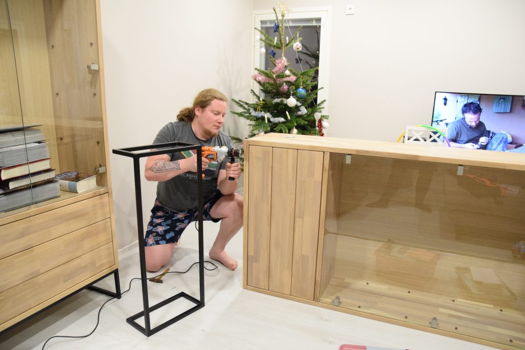 Kotimme täydentyi talven aikana ihanilla sisustuselementeillä. Jouluksi pihaan tuotiin Anttiinasta tilatut valkotammiset ja massiivipuiset olohuoneen vitriinit. Olihan siinäkin työtä, että ne saatiin kahdestaan sisälle, kun näihin kuljetuksiin ei ikinä kuulu sisään kantoa. Ihanaa joulupuuhaa olikin järjestellä kirjoja ym. uusiin vitriineihin.