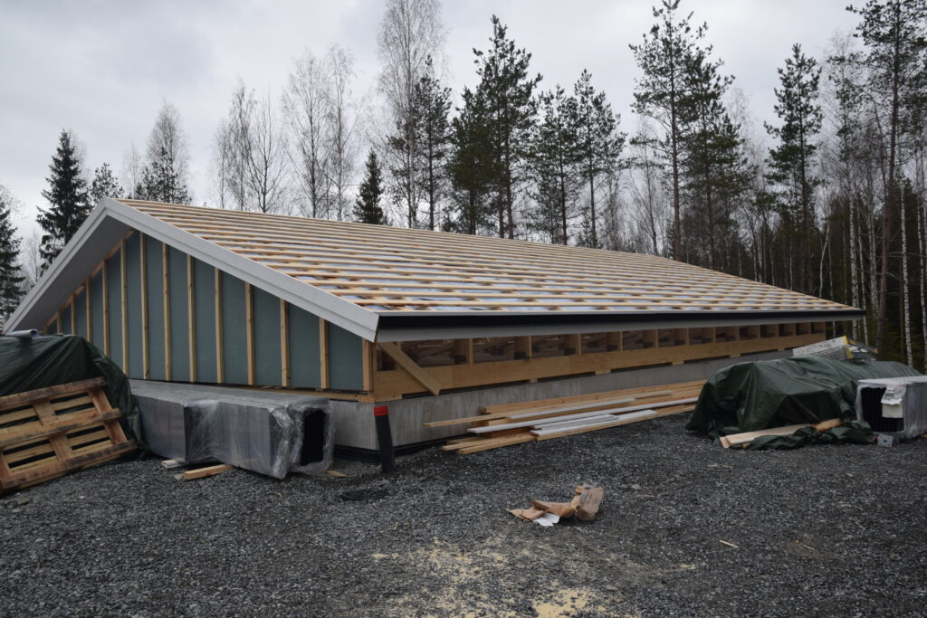 Kun perustukset olivat valmiina, Jopera alkoi rakentaa meidän tontilla. Ensin tuli valmiiksi katto. Katto perustusten päällä oli hauska näky. Meidän matala majamme. Seiniä tehtiin tontilla pari viikkoa. 17.5. kattomme kohosi korkeuksiin, sillä talomme oli vihdoinkin saanut seinät paikoilleen! Kylläpä se näyttikin korkealta ja komealta, varsinkin metsän puoleisella reunalla, jossa se on korkean sokkelin päällä.