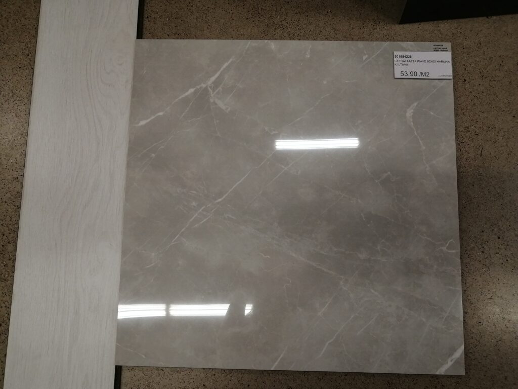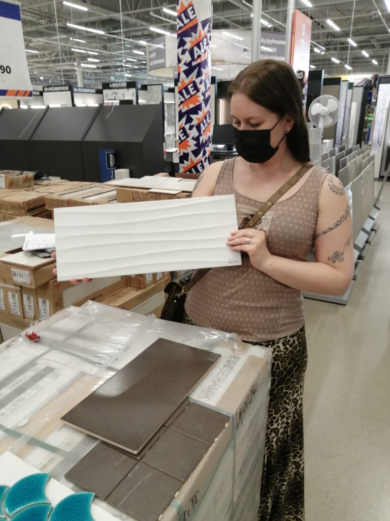 Jopera tekee lattia- ja seinäpintojen osalta yhteistyötä K-Raudan kanssa. Toukokuussa kävimme suunnittelemassa niitä asiantuntijan avustuksella. Aluksi vaihtoehtoja tuntui olevan liikaa ja päätöksenteko mahdotonta. Pienen alkutahmeuden jälkeen pääsimme kuitenkin vauhtiin. Aloitimme meidän tulevasta spa-osastosta. Ajatuksena oli saada sinne laguunifiilistä meille ikuisille matkakuumeilijoille. Suunnittelu lähti shampoosyvennyksen turkoosista mosaiikkilaatasta. Ruskea väri kiehtoi meitä myös. Vähän aikaa laattoja pyöriteltyämme, keksin, että vaalea aaltokuvioinen Cello Appeal (20×50 cm) laatta laitetaan isolle seinälle turkoosin syvennyksen kanssa ja ruskea sileä laatta pienemmälle ikkunaseinälle. Lattiaan tulisi myös ruskeaa laattaa erittäin tärkeällä yksityiskohdalla eli glitterisellä epoksisaumalla. Olimme saaneet idean kimalteiseen saumaan ystäväpariskuntamme kylppäristä. Molempiin vessoihin tulee laattaseinä lavuaarin puoleiselle seinälle. Niihin valitsimme myös kimalteista mosaiikkilaattaa yksityiskohdaksi. Pienen bling blingin lisäksi marmorikuviot puhuttelivat. Yläkerran vessaan valittiinkin valkoista marmoria laatoitettuun seinään.