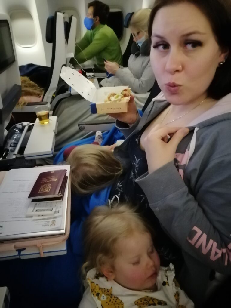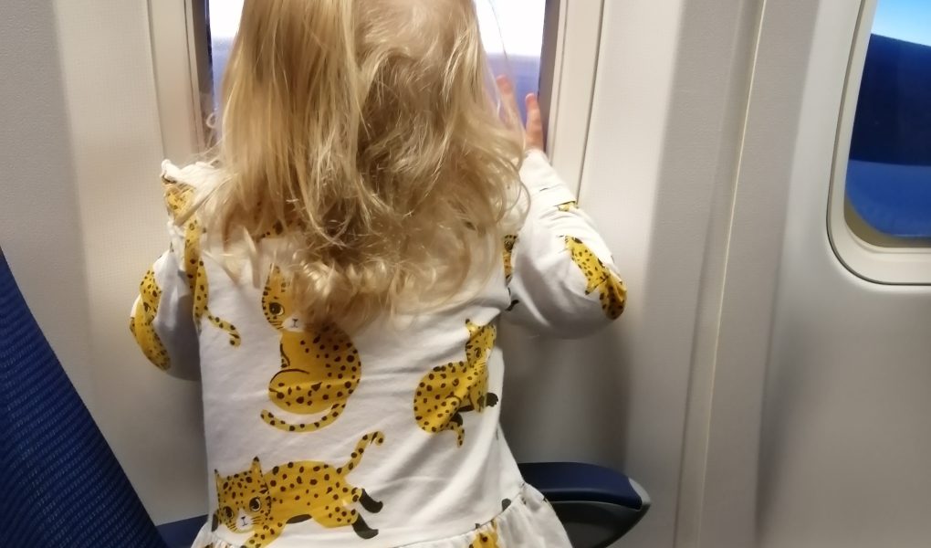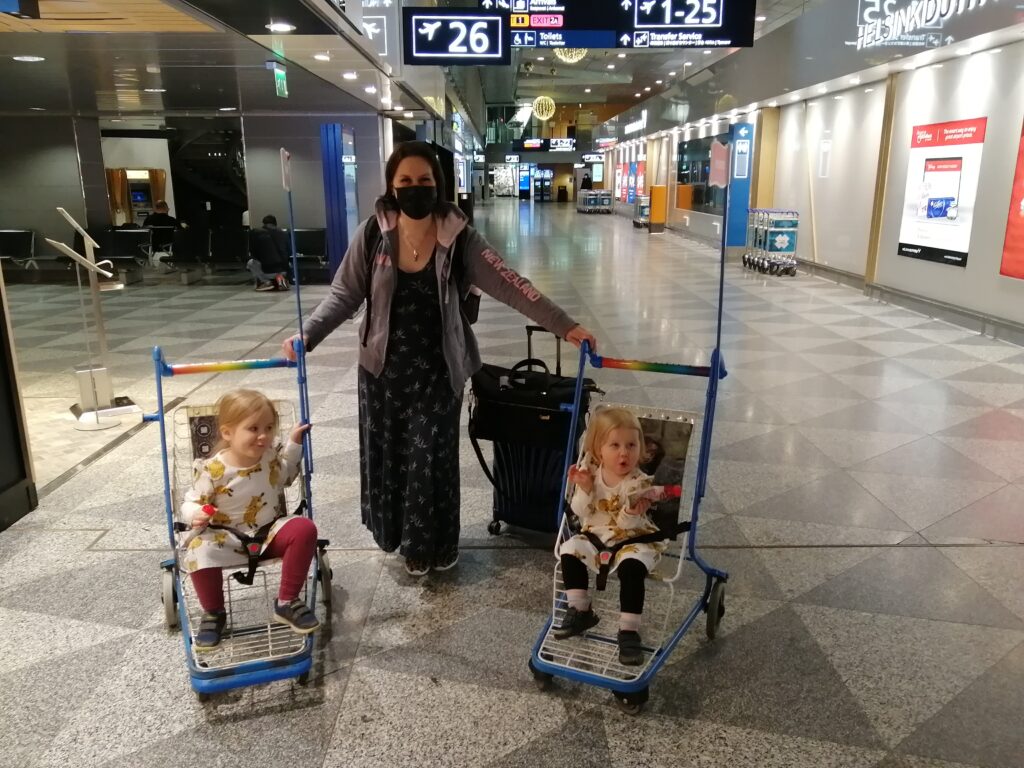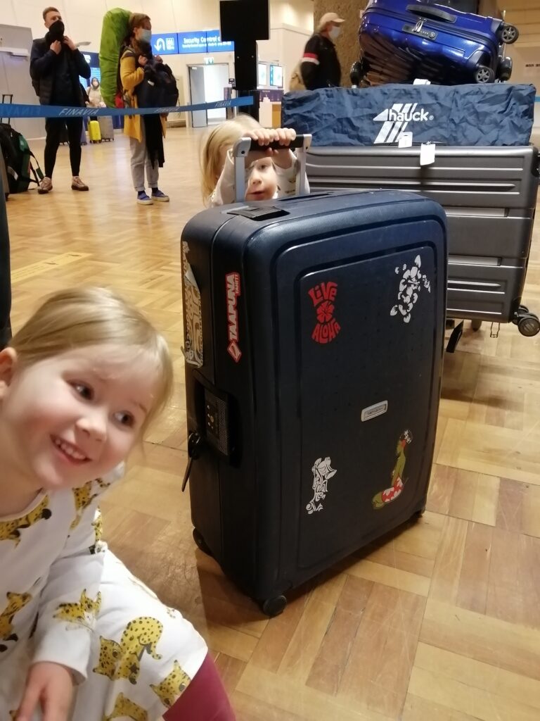 Epätodellinen oli nyt tullut todeksi. Viimeinen työpäivä tänä vuonna oli suoritettu, kuukauden loma oli muutama tunti sitten alkanut ja öinen lähtö lentokentälle klo 2 oli käsillä. Lapset olivat nukkuneet neljä tuntia, mutta olivat niin lähtöfiiliksissä, että eivät nukahtaneet kahden tunnin automatkalle. Tuleva väsymys oli koko ajan mielessä, mutta nyt oli ihan hyvä. Hiljaista motaria saimme ajaa. Vähän oli jopa ”rikollinen” olo kun yön pimeydessä livahdimme lentokentälle suositusten vastaisesti. Mutta mukavasti matka meni. Olimme perillä Helsinki-Vantaalla ennen neljää. Antti meni viemään autoa parkkiin, minä lastauduin tavaroiden ja lasten kanssa hiljaiseen pääaulaan. Mila työnsi innokkaasti Aavaa rattaissa. Siitä alkoi toistaiseksi pisin maskin käyttö -putki, noin 18 tuntia.