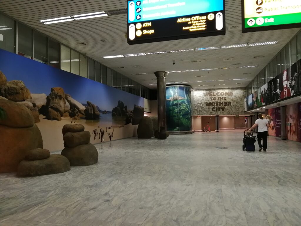 Me lentokoneen perältä olimme luonnollisesti viimeisten joukossa, kun tulimme koneesta ulos ja viimeisiä ensimmäisessä jonossa, joka tuntui hyvin pitkältä ja hitaalta. Kyse oli ”terveystsekkausjonosta”. Siinä piti luovuttaa lentokoneessa täytetty terveyskysely, näyttää covid-testitodistus (kaikkien yli 5-vuotiaiden) ja lämmöt skannattiin jokaiselta noin metrin päästä mittaavalla laitteella. Läpi meni kaikkien osalta ja meidät hyväksyttiin terveinä maahan, ilman karanteeneja. Sitten vielä passintarkastus ja laukut olivat jo hihnalla meitä odottamassa. Hienosti olivat Schipholin työntekijät kiidättäneet laukkumme hiukan kiirevaihdossa seuraavaan koneeseen. Welcome to Mother City luki isolla tyhjässä aulassa. Toki kello oli yli kymmenen illalla, mutta kummallisen autiota oli kentällä. Taxilla kesti parikymmentä minuuttia keskustaan. Autio oli sekin, täällä on ulkonaliikkumiskielto klo 23-04.