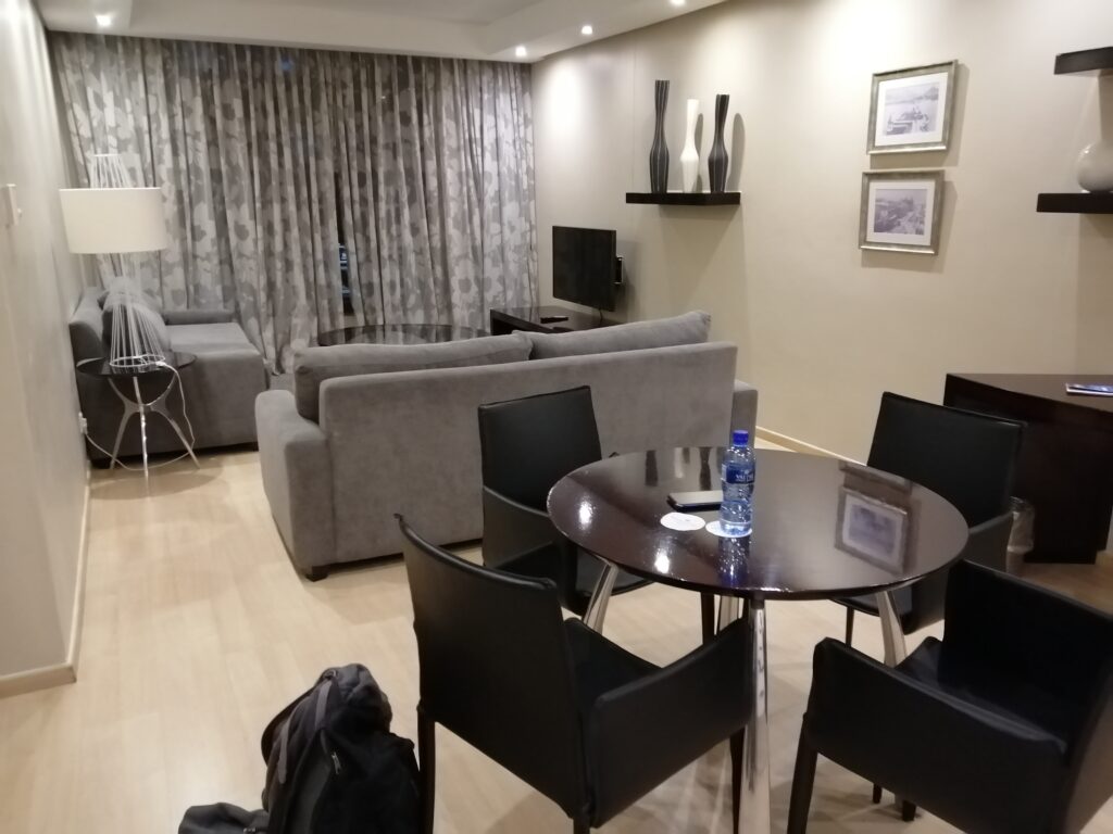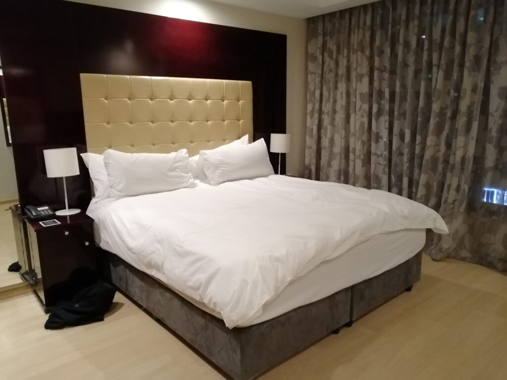 Huoneistohotellimme Protea by Marriott on keskustan bisneskortteleiden luona, kävelymatkan päässä satamasta. Normaalin sisäänkirjautumisen lisäksi täälläkin täytettiin terveyskysely (vain aikuisilta) ja mitattiin lämmöt. Laukkujen pinnat puhdistettiin henkilökunnan toimesta. Sitten päästiin vihdoinkin kotiutumaan omaan kaksioon ja poistamaan maskit naamalta. Meille oli muhkea king size bed makkarissa. Olohuoneen sohvat eivät olleet vuodesohvia, mutta rakensimme isoista sohvatyynyistä ”sänkymaailman”, johon tytöt simahtivat nopeasti. Vielä piti jaksaa käydä suihkussa, ihan umpiväsyneenä ja kellon ollessa jo kaksi. Epätodellista, että olimme nyt perillä ja nyt lopultakin sängyssä.