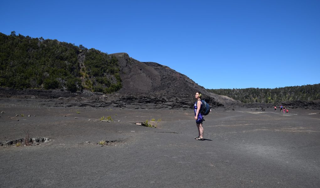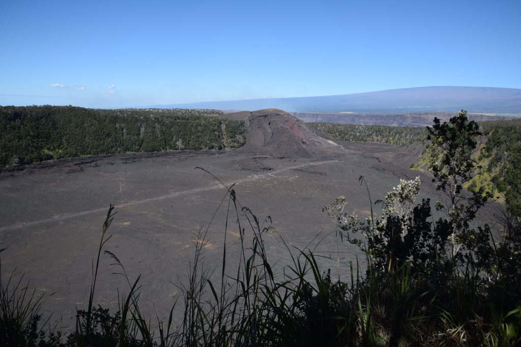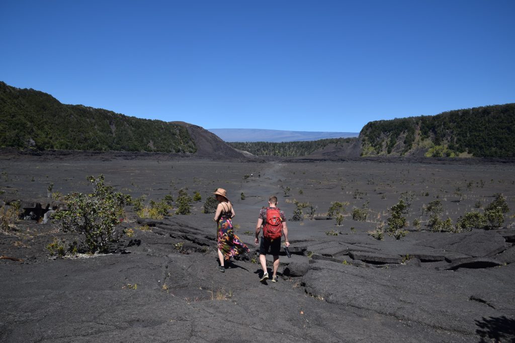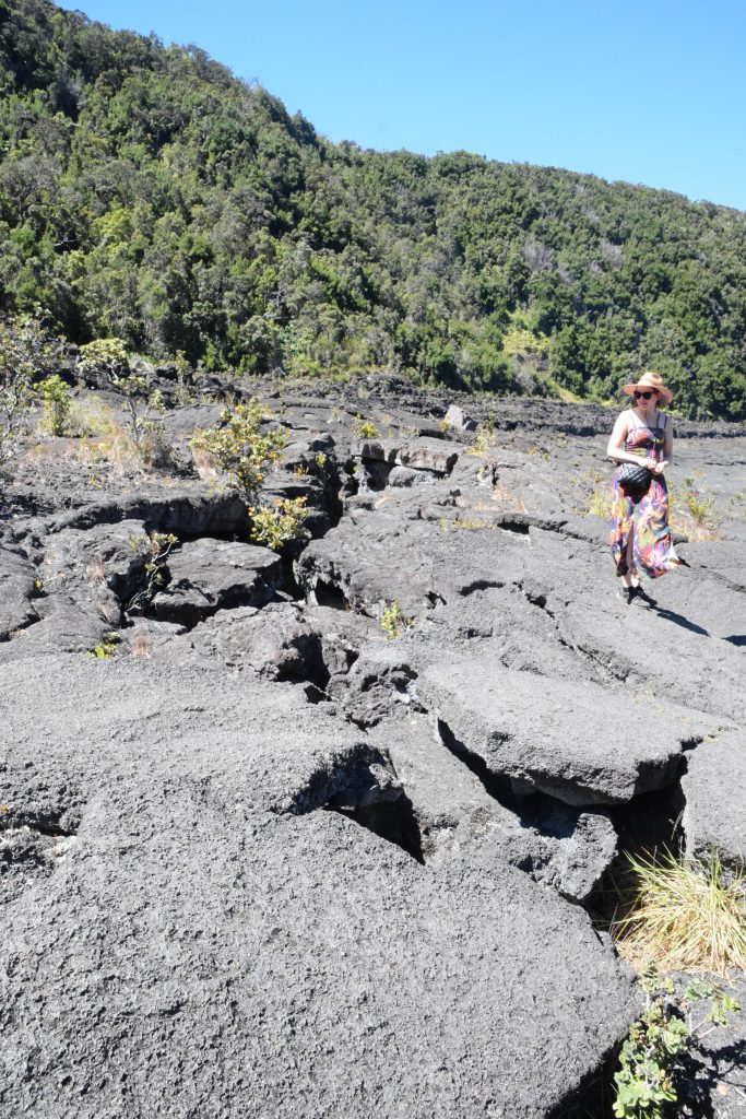 Nahukun läheltä alkoi Kilauea Iki trail, 3,3 mailin (5,3 km) reitti, joka laskeutuu kivettyneeseen vuoden 1959 laava-altaaseen Kilauea Iki kraaterissa. Laskeuduimme loivaa sademetsän ympäröimää rinnettä. Vastaan tuli porukkaa, jotka tekivät lenkkiä vastakkaiseen suuntaan, kaikki ystävällisesti tervehtien. Kun olimme pohjalla, nautimme banaani- ja keksitauon. Autio laavakivimaisema oli hieno näky. Isoja laavasäröjä oli siellä täällä, joten astumisessa oli monessa kohtaa oltava tarkka. Saniaisen näköistä kasvia puski säröistä. Laavakentille tyypillinen punainen lehua kasvoi myös monessa kohdassa. Laavakentällä kasvoi myös ohelo, mustikan sukuinen pikkupensas, jossa oli punaisia marjoja sekä pikkuruinen bambuorkidea. Laavakentän toisella puolella oli hyvin rosoista maastoa ja kävelemisessä oli oltava hyvin varovainen, ettei muksahtanut terävään laavan reunaan. Laskeutuminen kraateriin oli ollut loiva, mutta tässä suunnassa nousu takaisin metsään oli jyrkkä. Pulssi nousi ja hiki alkoi valua, välillä kivisissä portaissa, välillä jyrkällä rinteellä. Käveltävää oli ihan reippaasti, kun kävelimme kraaterin yläreunaa pitkin kraaterin toiselle puolelle. Välillä puiden ja pensaiden välistä avautui upea näky alas Iki kraateriin, jossa juuri hetki sitten talsimme.