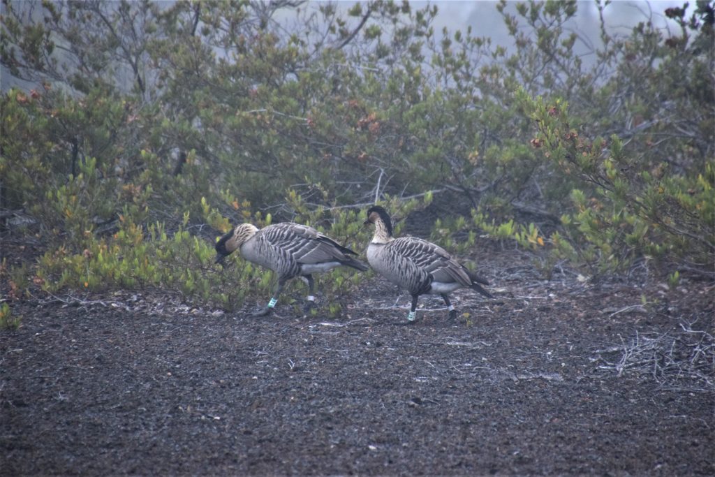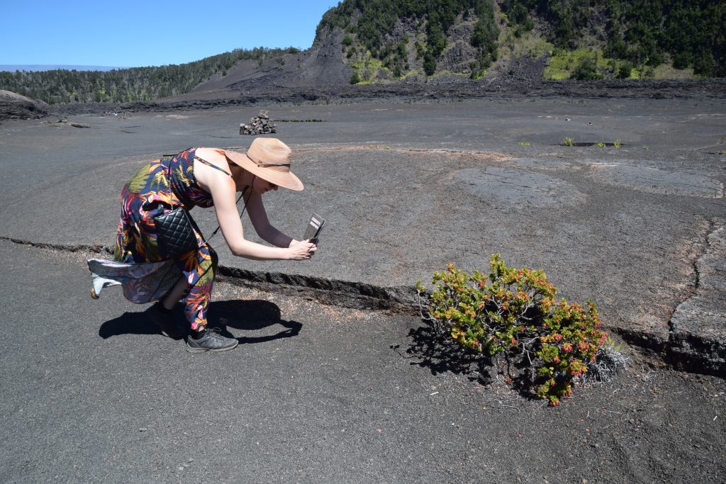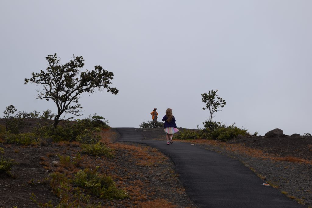 Ennen kuutta illalla ajoimme Devastation trailin parkkiin. Se parkki oli suosituin ennen auringonlaskua ja onneksi mahduimme sinne vielä. Sieltä oli 1,5 kilometrin kävely Halema’uma’u kraaterin lähimmälle lookoutille. Juhani ja Niina menivät edellä, me tulimme Milan kanssa perhevauhtia. Suurimmaksi osaksi reitti oli helppoa asfaltoitua käveltävää. Matkalla tapasimme muutaman nenen puskaisessa maastossa.