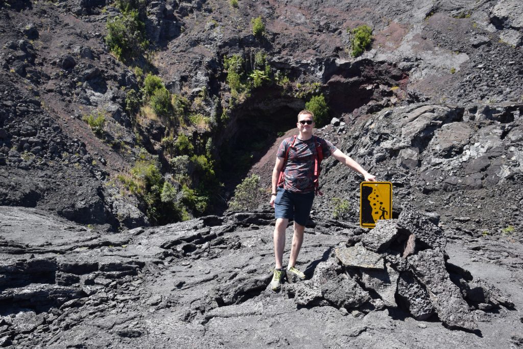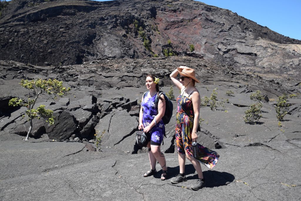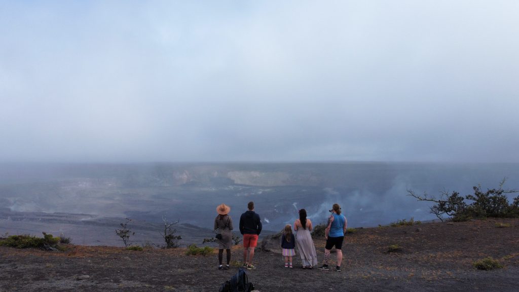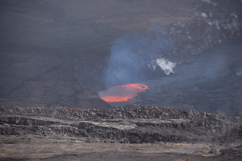 Kilauea lookoutilla pääsi katsomaan sammunutta kraateria ja aktiivista Hale ma’uma ’u kraateria. Siellä oli mukavasti tilaa ja kraaterin reunaa pitkin pääsi kävelemään pitkälle. Kaivoin kameraani esille, kun Niina sanoi, että tuolla näkyy laavaa. Siellä oli meidän suureksi ihmeeksi oranssi pinta-alaltaan metrien kokoinen laavapurkaus/laavalampi. Oranssi hehku kesti vain hetken, sillä laava jähmettyi hyvin pian. Toista purkausta ei tullut, joten olimme todella onnekkaita, kun näimme tämän jo nyt. Lennätimme hetken dronea. Olin viemässä sitä kalderan ylle, kun se sanoi, ”landing”, meille tuli kiire saada se takaisin. En tiedä mitä se sekoili, akkuakin oli reilusti. Roonin halusta laskeutua kalderaan tulikin sitten päivän vitsi.