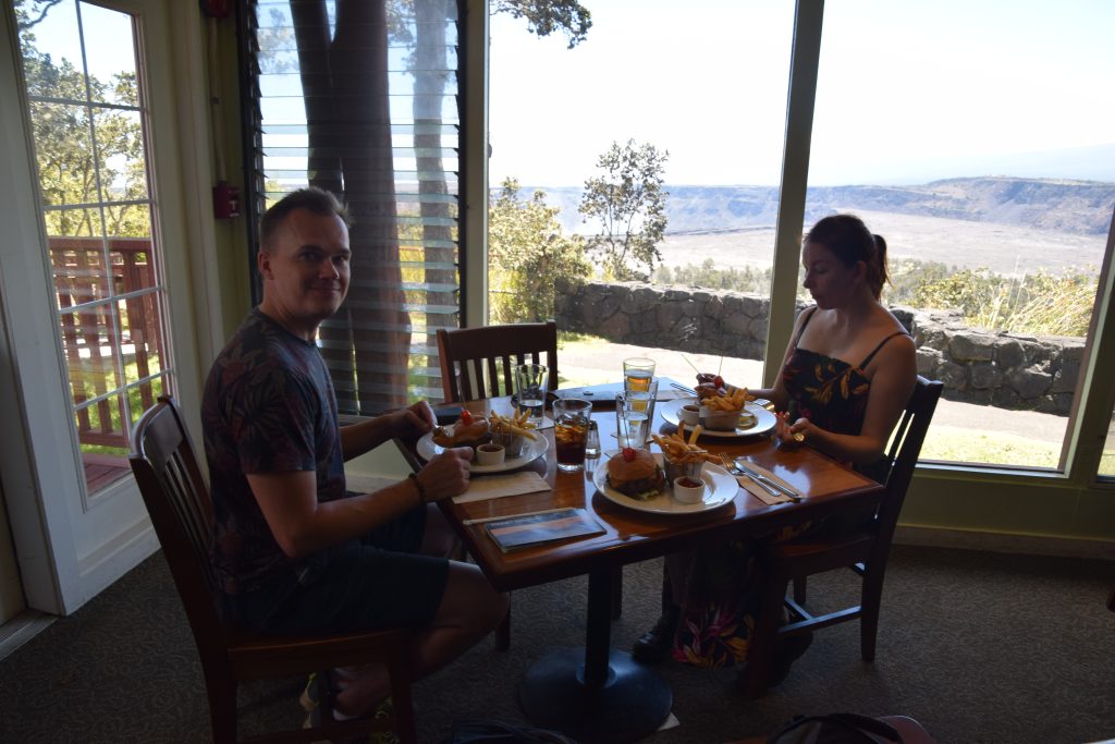 Aloimme lähestyä lounasaikaa. Volcano House noin sadan metrin päässä visitor centeristä tarjosi hotellimajoitusta ja ravintolan. Menimme sinne syömään. Burgerit olivat taas hintalaatusuhteeltaan paras vaihtoehto. Maisema pöydästä oli hieno, suoraan Kilauean isolle kraaterille. Kauemmasta aktiivisesta Halema’uma’u kraaterista nousi savua.