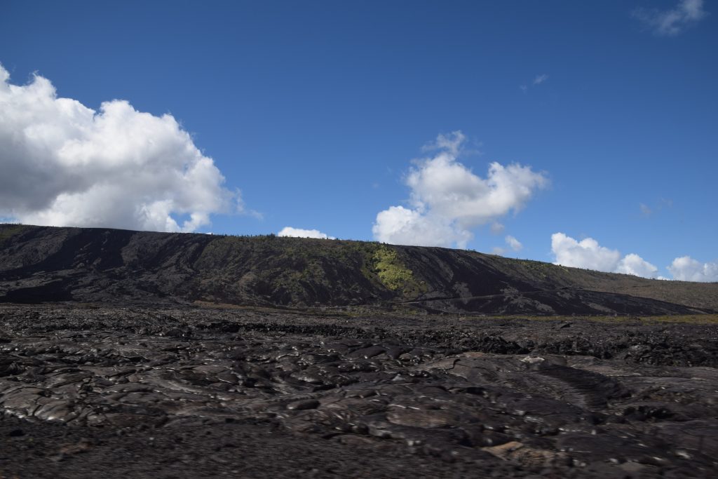 Teimme viikon aikana kaksi retkeä Volcanoes National Parkkiin, jotta ehdimme tehdä kaiken siellä mitä halusimme. Ensimmäiselle retkelle kello soi jo kuudelta ja lähtö oli klo 7. Queen Ka’ahumanu hwy:ltä pääsimme pian saaren halkovalle Saddle roadille. Se on suurien korkeusvaihtelujen tie. Sisäsaareen mennessä tie nousee jättäen vasemmalle puolelle Mauna Kean, 4200 metriä korkean vuoren, ja luonnollisesti vastarantaa kohti laskee. Saddle roadin molemmin puolin on avaraa loivasti nousevaa vuorimaisemaa ja laidunmaata. Vuohet ja lampaat laiduntavat siellä. Ikävän paljon tapasimme vuohia karja-aidan väärällä puolella yrittämässä ehkä pian tien ylitystä. Niitäkin tuli tiellä vastaan, jotka olivat epäonnisesti sitä yrittäneet. Kun lähestyimme saaren vastarantaa, laidunmaiden seassa olleet paljaat laavakentät saivat kasvillisuutta yhä enemmän päällensä. Perillä oli jo hyvin vehreätä.