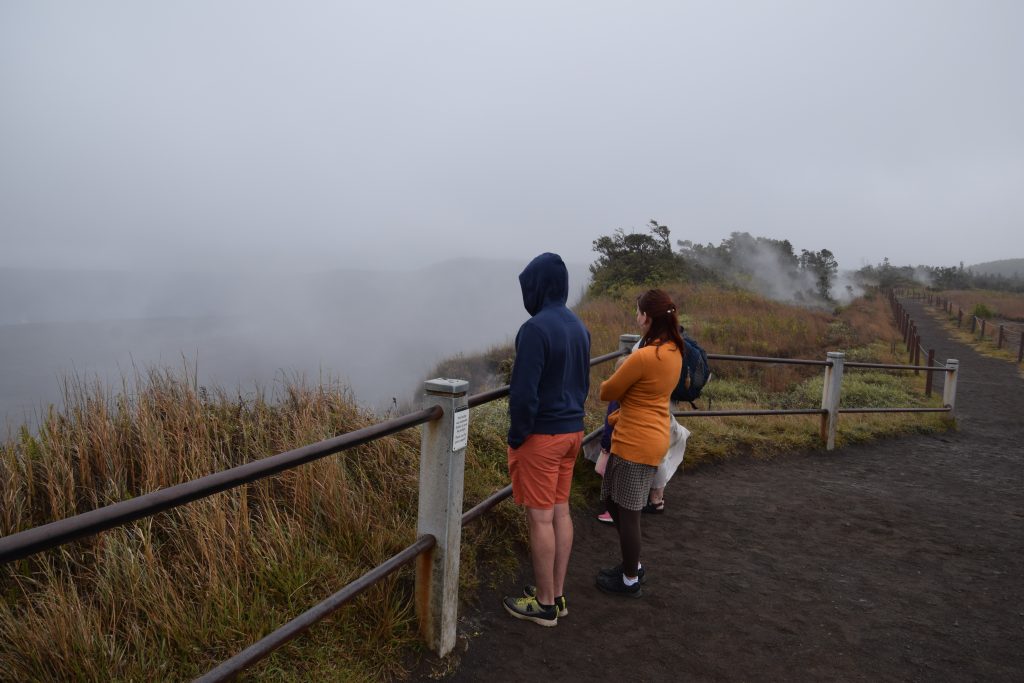 Toisella kerrallamme National Parkissa sää ei ollut yhtä aurinkoinen ja pilvetön kuin ensimmäisellä. Tullessa Kilauean kraateri oli sumun peitossa, mutta selkeni päivän edetessä. Ajoimme steam venteille, jossa höyryä tuli maan alta rakosista.