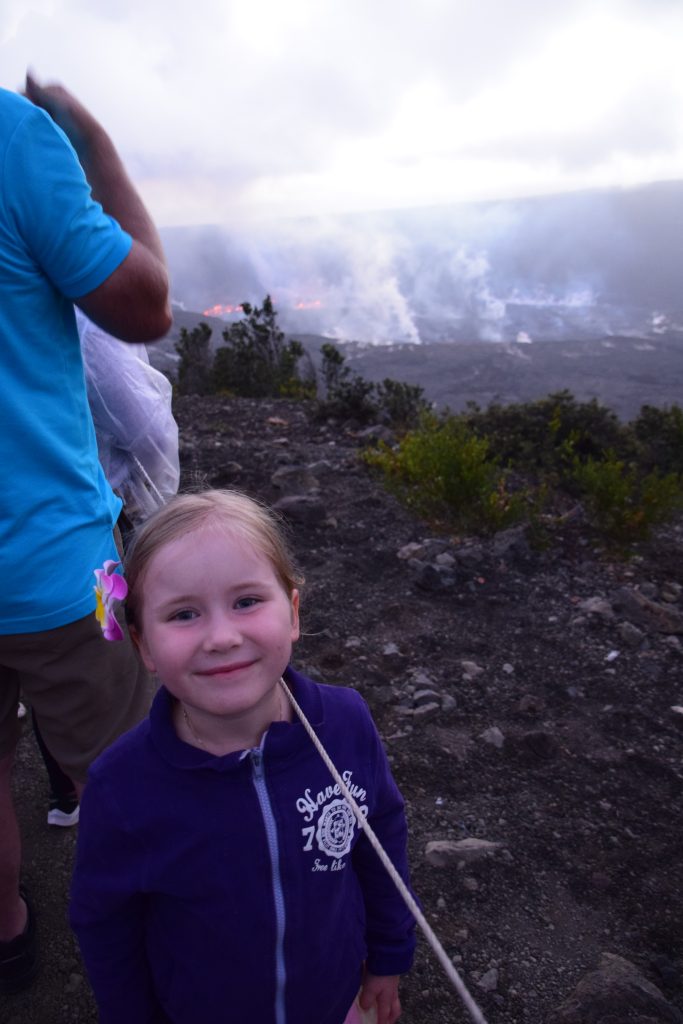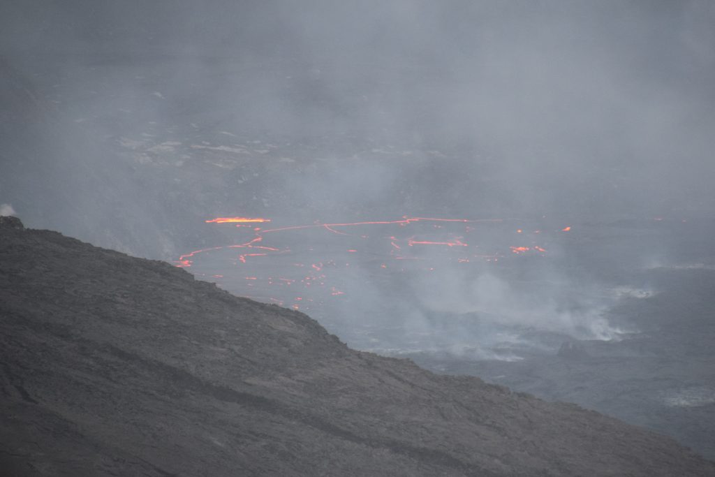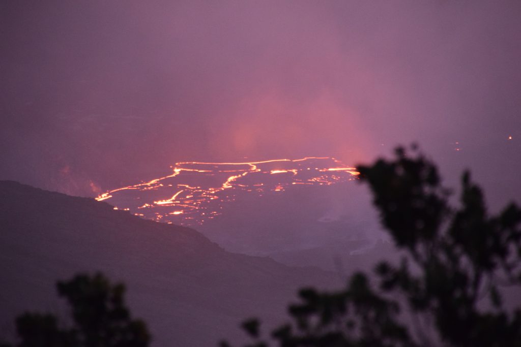 Olimme pian perillä lookoutilla, jonne monet muutkin suunnistivat auringonlaskun aikaan, mutta ruuhkaksi asti ihmisiä ei ollut. Vaikka taivas oli vielä vaalea eikä aurinko ollut vielä laskenut, upeat hohtavat laavajuovat näkyivät parissa kohtaa kraaterissa. Kraateri oli alkanut muutama päivä sitten purkautua reilummin, eli meillä oli onnea, kun olimme täällä oikeaan aikaan. Auringon laskiessa ja taivaan hämärtyessä, laavajuovat tulivat esiin yhä selkeämmin. Pian myös toisella puolella valtavaa kraateria näkyi oranssina hohtavia pisteitä. Olin onnellinen, että olin pitänyt pääni ja tuonut Milan tälle retkelle. Tämä oli hänelle upea kokemus.