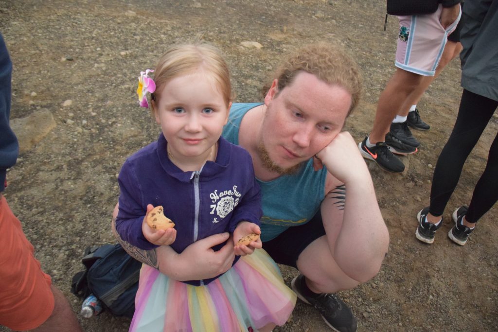 Hupparit olivat tarpeen, mutta niillä tarkeni hyvin. Voimistuvia laavahehkuja oli kiva seurata rauhassa. Kun pitkä turkoosihupparinen setä poistui meidän vierestä, näkymä kalderaan parani entisestään. Antti ja Mila lähtivät edeltä takaisin päin. Me muut lähdimme seitsemän jälkeen. Oli täysin pimeätä ja taskulamput otettiin esiin paluumatkalle. Porukkaa tuli vielä lookoutille. Kalderan hehku näkyi punaisen oranssina pitkälle Devastation roadille asti. Olimme lähellä parkkipaikkaa, kun edestä kuului pilkkopimeässä tytön laulua. Mila lauloi Ihme ja kumma -laulua pilkkopimeässä yössä. ”Siilillä on piikit, linnuilla on höynenet, pupulla ja oravalla turkit pehmoiset….” Yhdestä kaatumisesta huolimatta Mila oli jaksanut hienosti kävellä retken viimeisenkin osuuden ja vieläpä hyvällä mielellä laulellen.